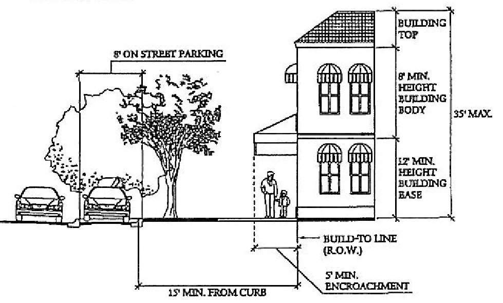 The cantilevered balcony should project no more that five feet from the principal facade. The balcony may encroach upon the public right-of-way, but shall project no closer than 18 inches from the face of the curb.