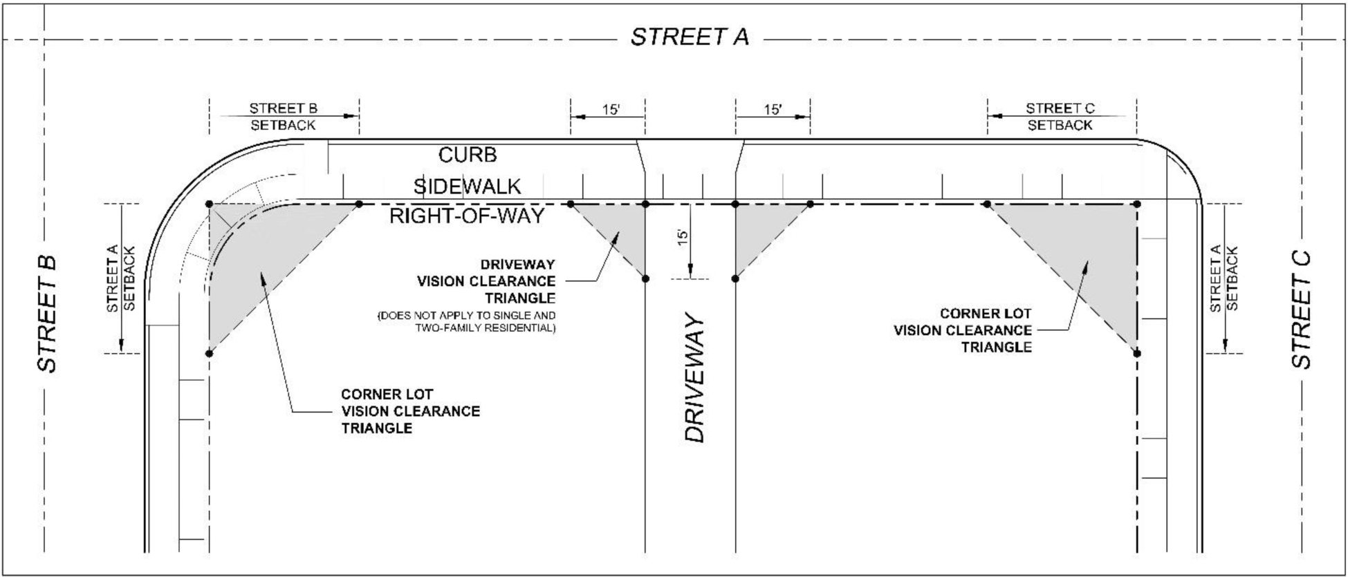 Vision clearance triangle illustration. The following illustrates how to determine the extent of vision clearance triangles per subsections 52-32(1) and (2).