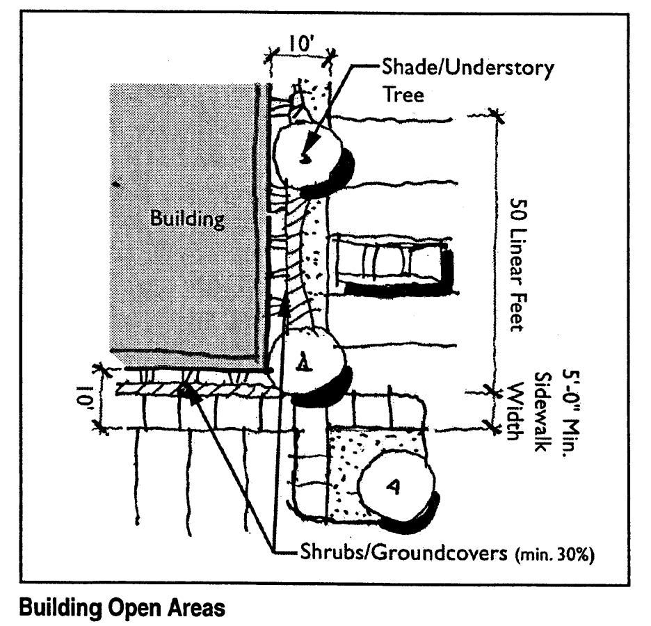 The remaining three sides of building perimeter shall include a 5′—0″ minimum continuous sidewalk as well as landscape planter areas along at least 60 percent of that linear distance.