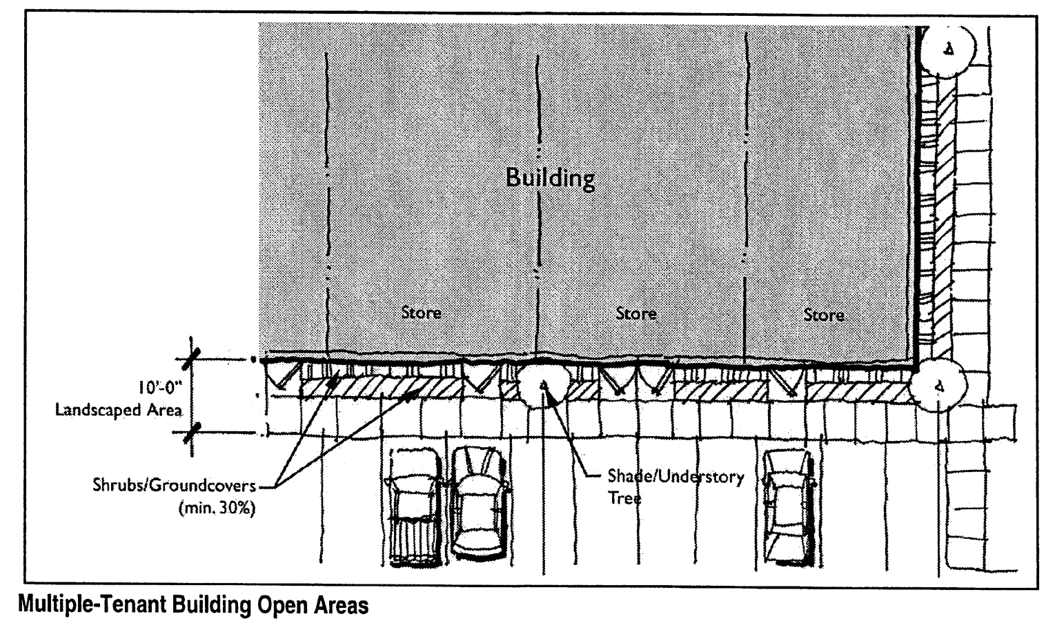 All edges of buildings shall have a foundation planting of shrubs and groundcovers as a minimum. Shrubs and groundcovers shall comprise at least 30 percent of the required green space.