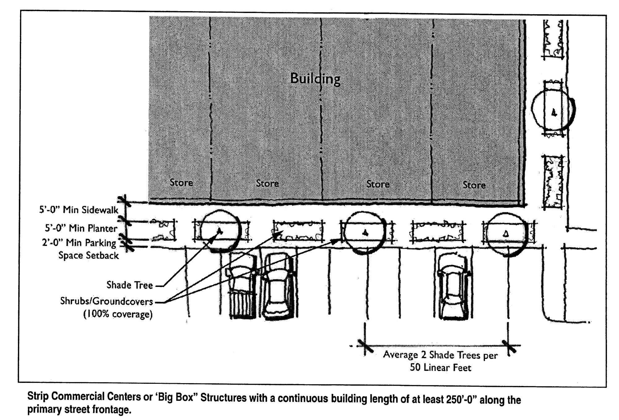 Landscaping shall be required around the perimeter of large strip commercial centers or "big box" structures with a continuous building length of at least 250′—0″ along the primary street frontage as follows: