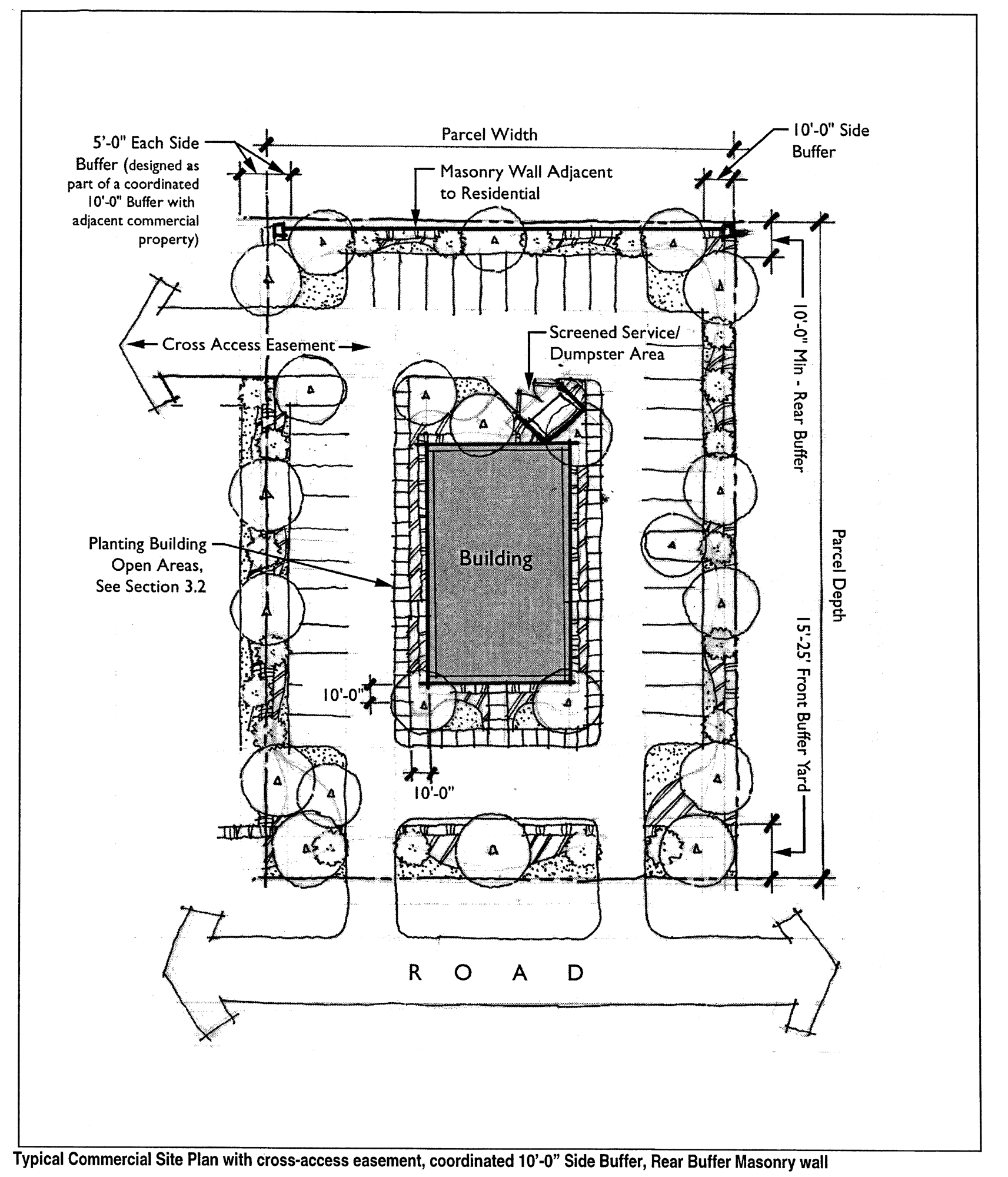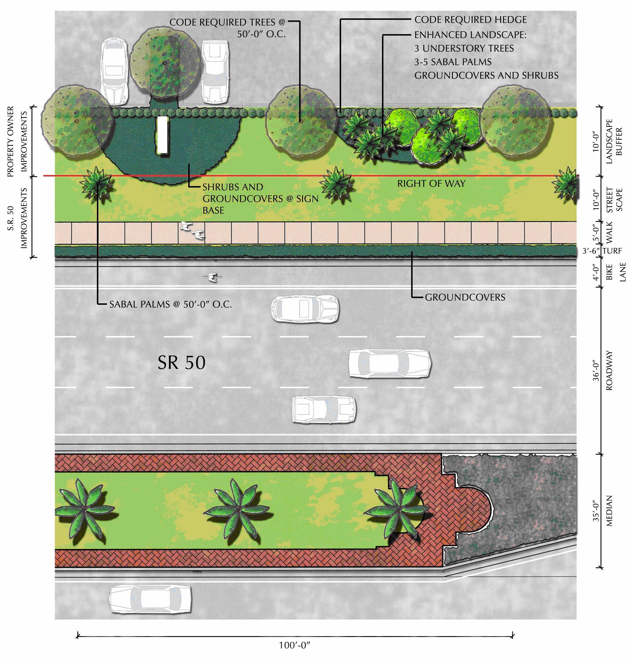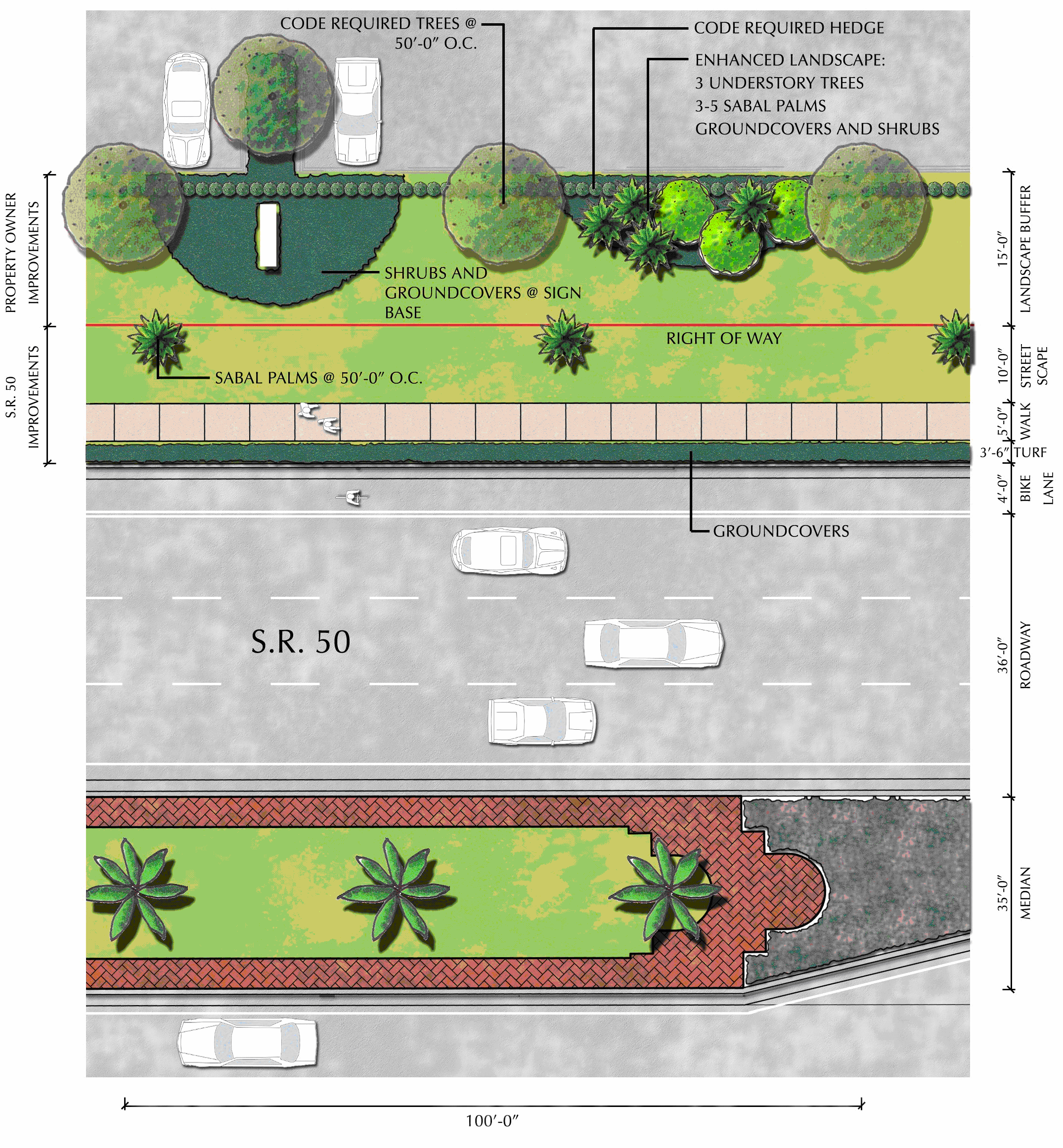 Note: An administrative waiver may be requested for any existing parcel that may require a front buffer width reduction that results in a landscape buffer less than the required minimum 10′ and was caused or created by the State Road 50 Road Improvements or any other third party.