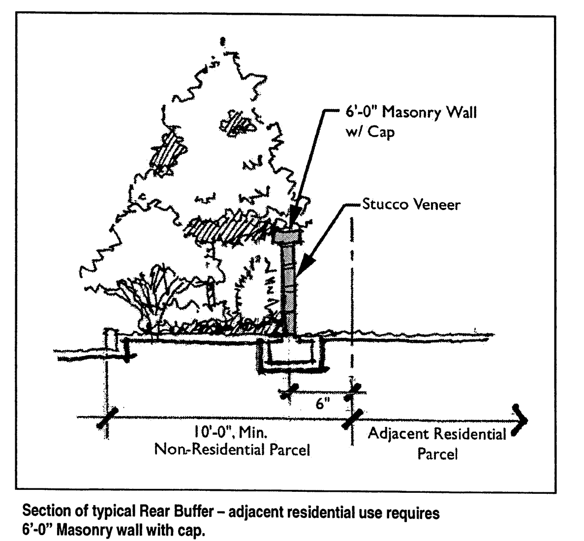 Side or rear buffers adjoining noncommercial or residential parcels, churches or institutional uses shall also require a six-foot masonry wall in addition to the minimum ten-foot wide landscape buffer requirement. The wall shall be constructed from decorative "split face" concrete masonry, "Norman" brick or standard concrete masonry clad with painted stucco or other masonry veneer. The wall shall include a continuous cap and end column features. The wall shall be placed a minimum of six inches from the adjoining property line. In addition, all active "yard and shop" spaces with open work areas or other supply areas shall be treated with a similar six-foot masonry wall. The city and applicant must mutually agree on which landscape buffer requirements are most appropriate with the submission of the development and/or site plan proposal.