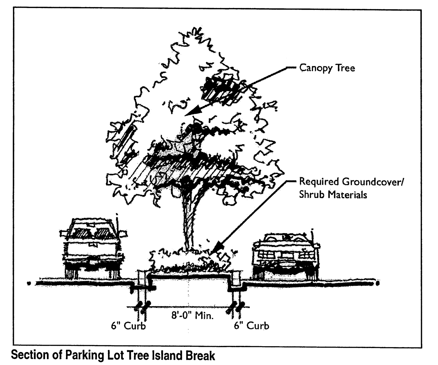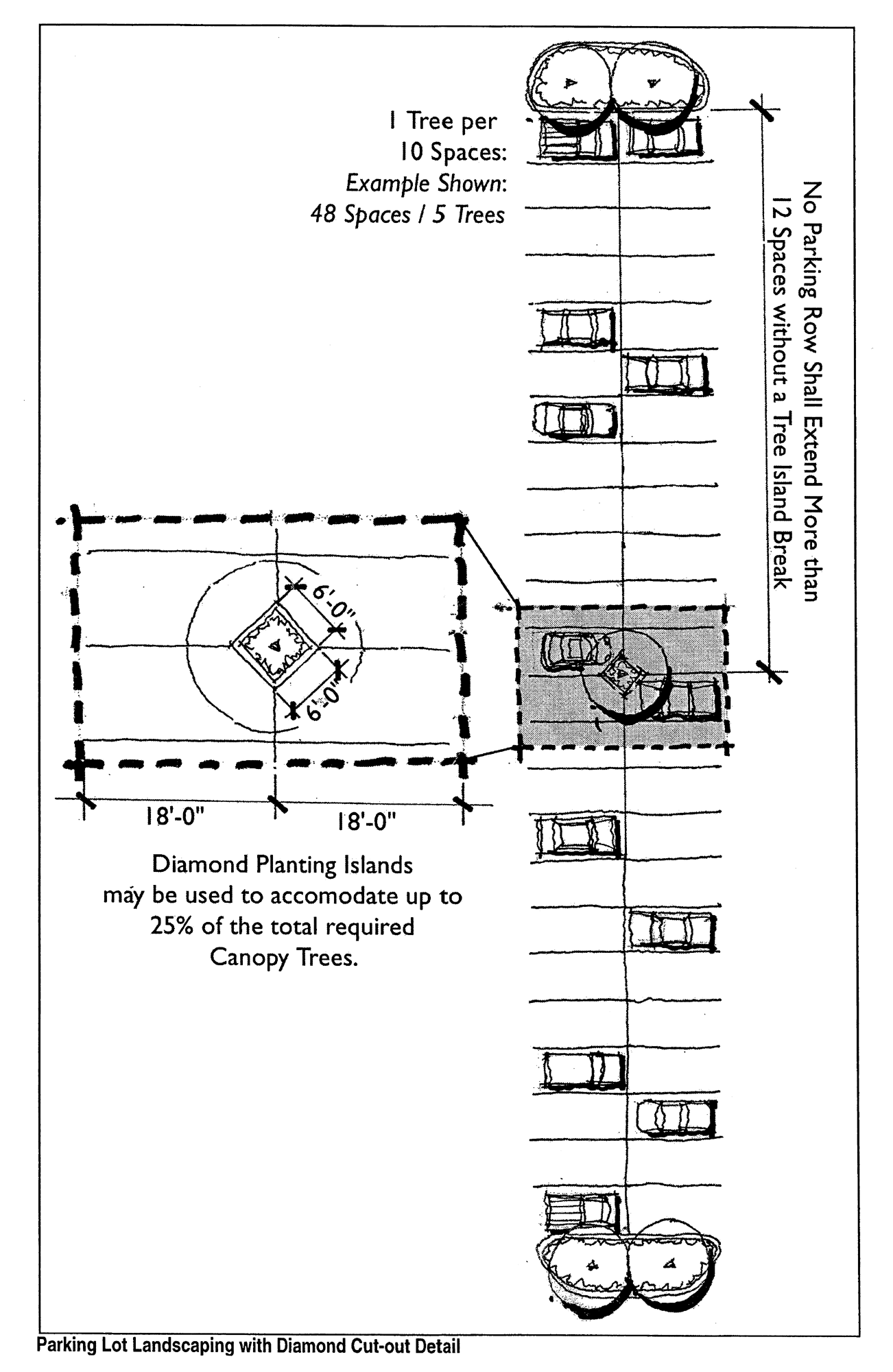 Parking lots shall be planted with canopy trees at a rate of one tree per ten spaces. Parking shall not extend more than 12 spaces without a tree island break.