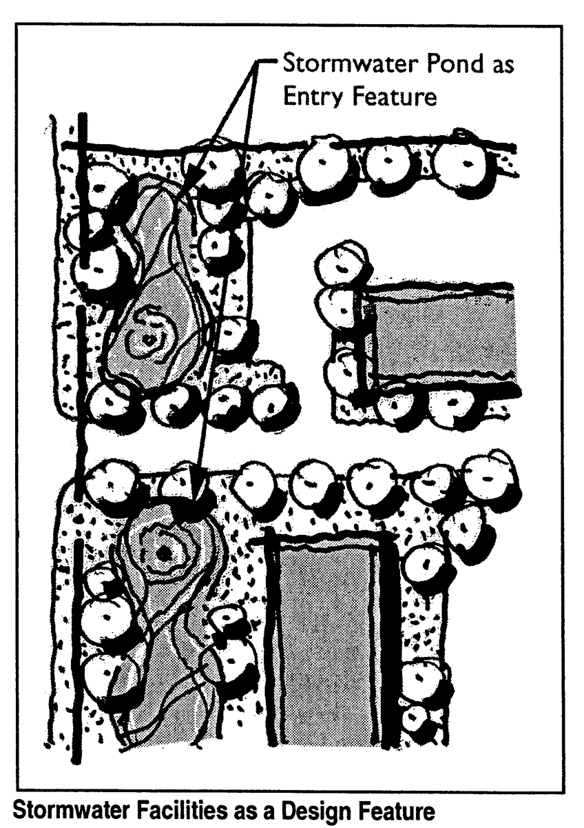 Stormwater facilities (ponds and/or depressions) shall be designed and utilized as site amenities along entrances and street frontages or incorporated with buffers between incompatible uses. These areas shall count toward open space requirements if the impervious area of the site does not exceed 75 percent.