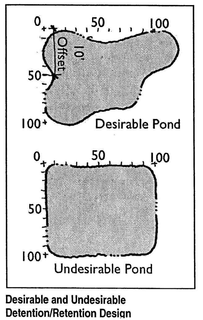 Wet stormwater detention/retention facilities adjoining public streets shall include a water feature such as a fountain or spray jet, and shall be planted with appropriate aquatic materials as outlined in the "Commercial Corridor Plant List." Detention/Retention along the front of a property shall be designed with curvilinear edges not as a straight "box." Retention embankments shall be planted with one tree per 50 linear feet of retention perimeter measured from top of slope. Trees shall be suitable for wet locations as identified in the Commercial Corridor Planter Materials List.