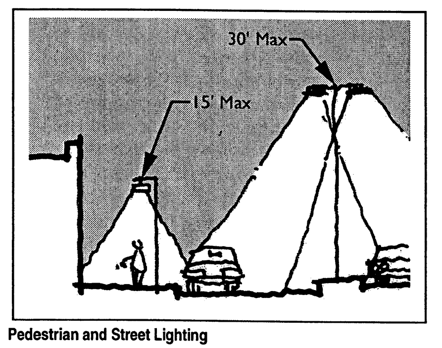 A light fixture (the pole and light source/luminary) shall be a maximum of 30 feet in height within any parking lot, and a maximum of 16 feet in height within any non-vehicular pedestrian area (with height being measured from the finished grade to the top of the light fixture).