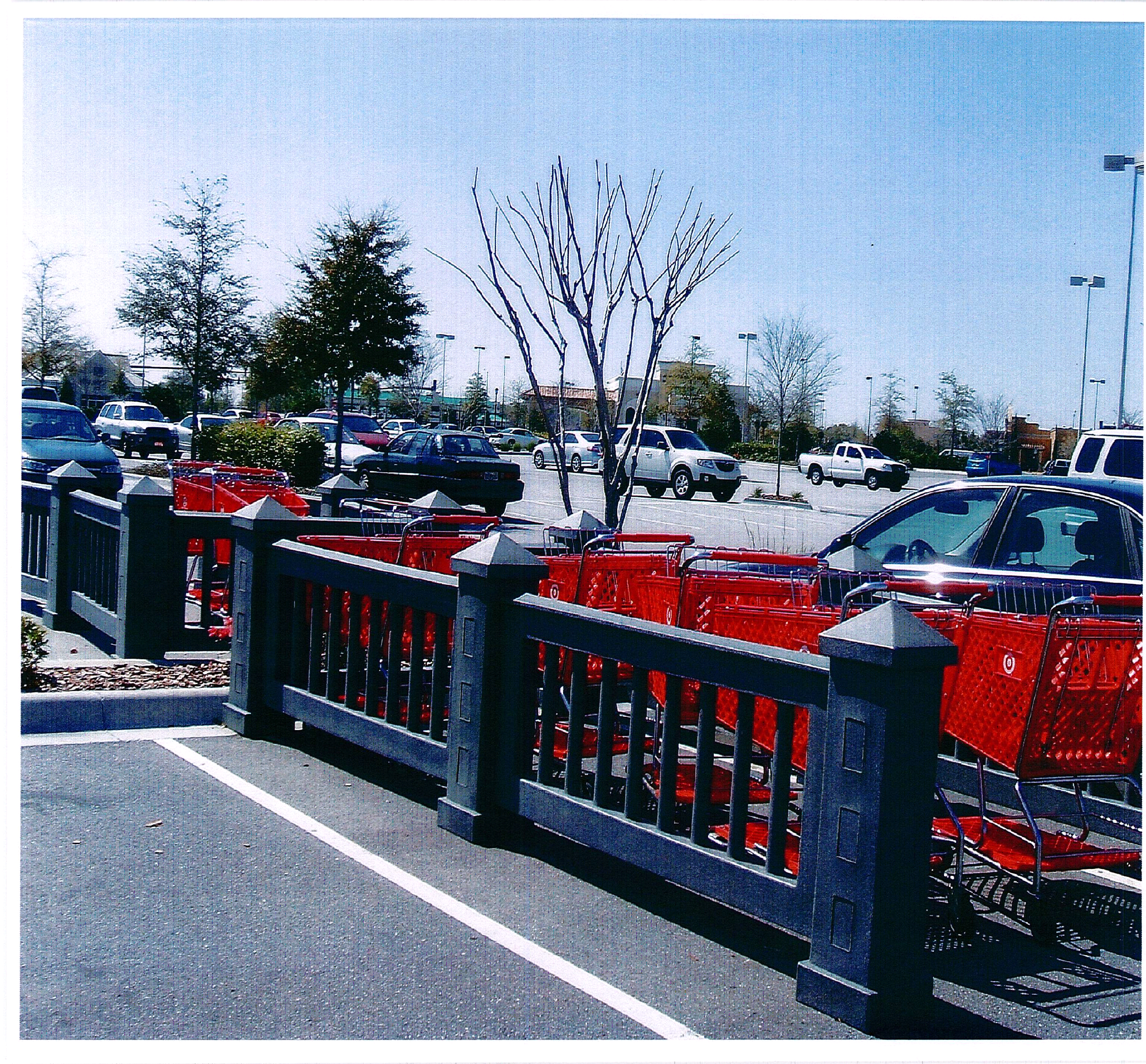 Shopping cart corrals within parking areas must be located within an acceptably designed nonmetal enclosure. Such enclosures must be designed to be compatible with the design and overall aesthetic vision of the commercial building they serve and meet the design standards illustrated herein. Landscaping may be employed to enhance the acceptability of a design by camouflaging or otherwise enhancing the appearance of corrals.