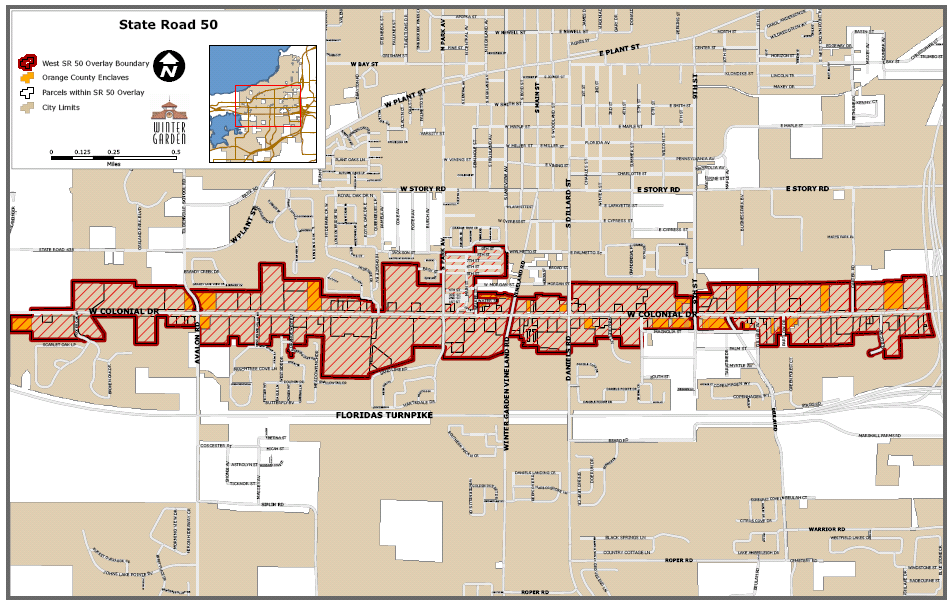 The boundaries for the West State Road 50 Overlay area extend 350 feet from the centerline of West State Road 50 and includes all parcels in the 350 foot distance. In addition, any parcel of land which is located within the 350 foot area that also has a portion of the entire parcel outside the 350 foot area but is part of the same parcel of land, shall be included within the commercial corridor as if the parcel was wholly situated within the stated corridor width and is also zoned C-2 or PCD. Single use residential zoned parcels are not included in the West State Road 50 Overlay Zone.