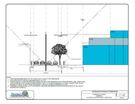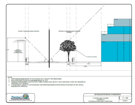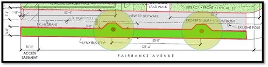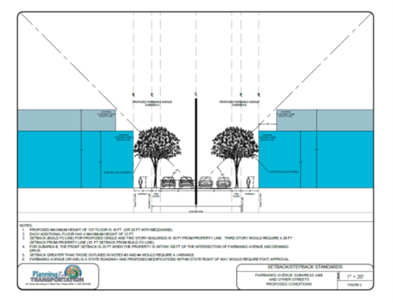 Setbacks: Orange Avenue zero front setback, except front setbacks must allow for at least a 17-foot wide sidewalk. On Denning Drive, a 20-foot setback shall allow for the multi-use trail and Minnesota Avenue setback must allow for at least a ten-foot-wide sidewalk and a five-foot buffer from the back of curb. Where the building requires an additional setback to achieve the required sidewalk, trail, buffer, or street tree canopy clearance, the area shall be dedicated as a public access easement.