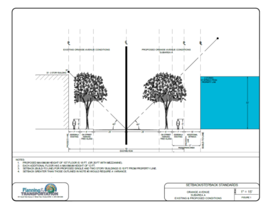 Zero-foot front setback along Orange Avenue, except front setbacks must allow for at least a 17-foot wide sidewalk and five-foot buffer at back of curb. All other street frontages must allow for a ten-foot sidewalk and five-foot buffer at back of curb. Where the building requires an additional setback to achieve a 17-foot sidewalk, the area shall be dedicated as a public access easement. Where the building requires an additional setback to achieve the required sidewalk, buffer, or street tree canopy clearance, the area shall be dedicated as a public access easement.