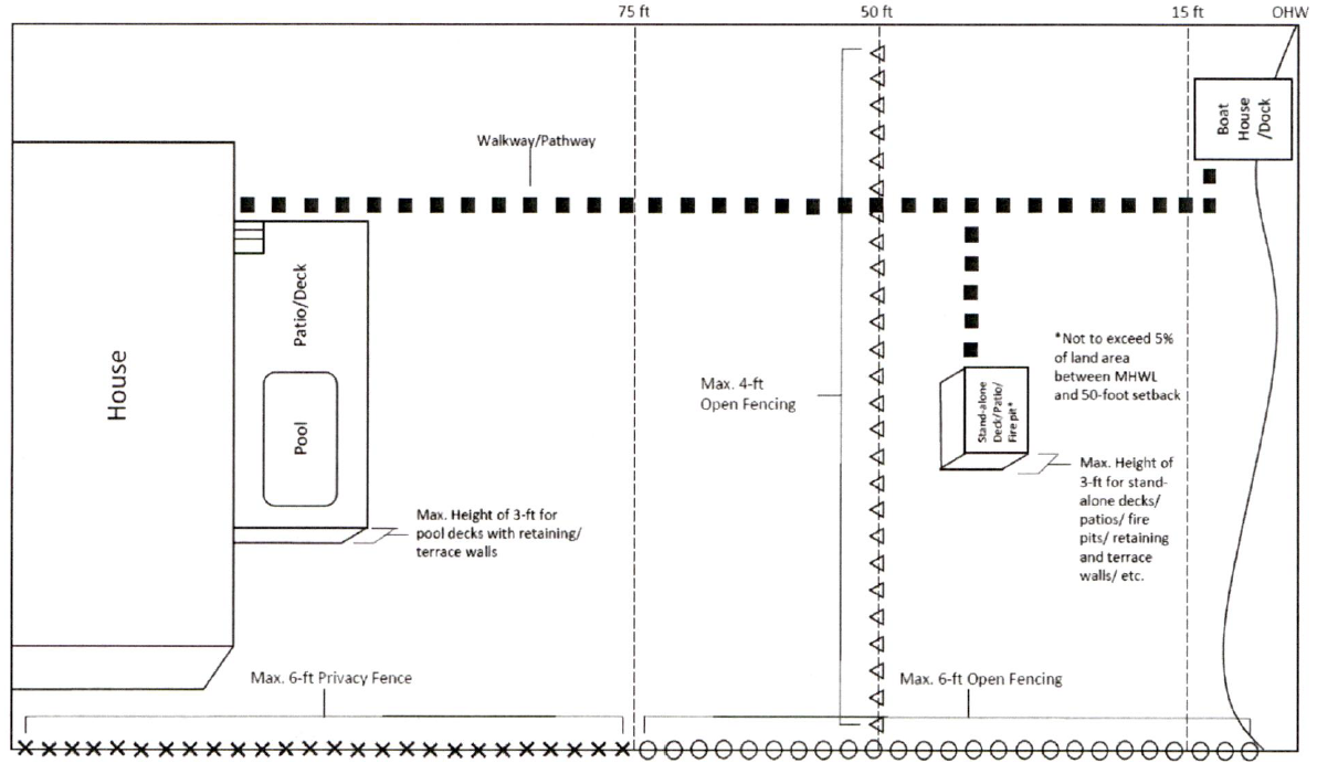 In order to maintain water views across properties, fences running down the sides of properties up to 75 feet setback from the ordinary high-water line, shall be permitted a height of up to 6 feet. Fences within the 75-foot setback, shall be 75 percent open, limited to materials such as aluminum picket, wrought iron, or green or black cladded vinyl chain link, which allow visibility across property lines and to the water. Wood shadow box fences shall not qualify as open fencing. The planning and zoning board may permit fences closer than 50 feet but only on canalfront or streamfront lots as necessary to enclose swimming pools. The following figure provides a summarized example of the overall requirements provided in the subsections above.