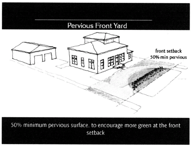 Buildings, accessory structures, patios, decks, drives and other impervious surfaces shall not cover more than 50 percent of the total land area of the lot and at least 50 percent of the front yard area must consist of pervious surfaces with landscaping material. In any area of the front yard hard surfaces such as concrete, asphalt, brick, pavers or similar materials, and driveways with stone or gravel may cover a maximum of 50 percent of the front yard area. Any areas outside of the defined driveway and walkways, shall contain landscaping materials. Mulch drives are prohibited. The front yard area includes that area between the front lot line and the front wall(s) or front porch of the home.