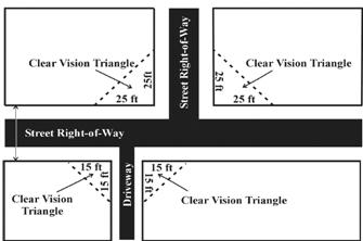 Fences, walls, structures, or plantings located in the clear vision triangle, as depicted below, shall not be permitted to exceed a height of twenty-four inches above the lowest point of the intersecting street(s). The unobstructed triangular area is described as follows: