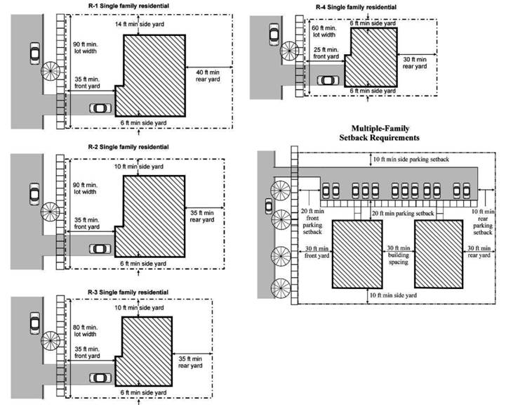Multiple-Family Building Setbacks. The setback requirements indicated in Table 3.05 shall be measured from the perimeter of the overall site or development. Parking lots shall be set back a minimum of twenty feet from the front lot line and ten feet from the side, and rear lot lines. Setbacks internal to the site shall be as follows: