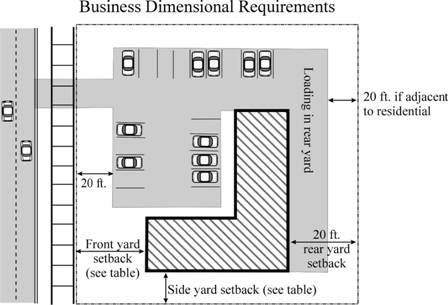 Side Yard Setbacks. No side yards are required along the interior side lot lines of the district adjoining another lot in the business district, with the provision of a fire rated wall as specified in the building code. If side walls of structures contain windows, doors or other openings, a minimum side yard of ten feet shall be provided.