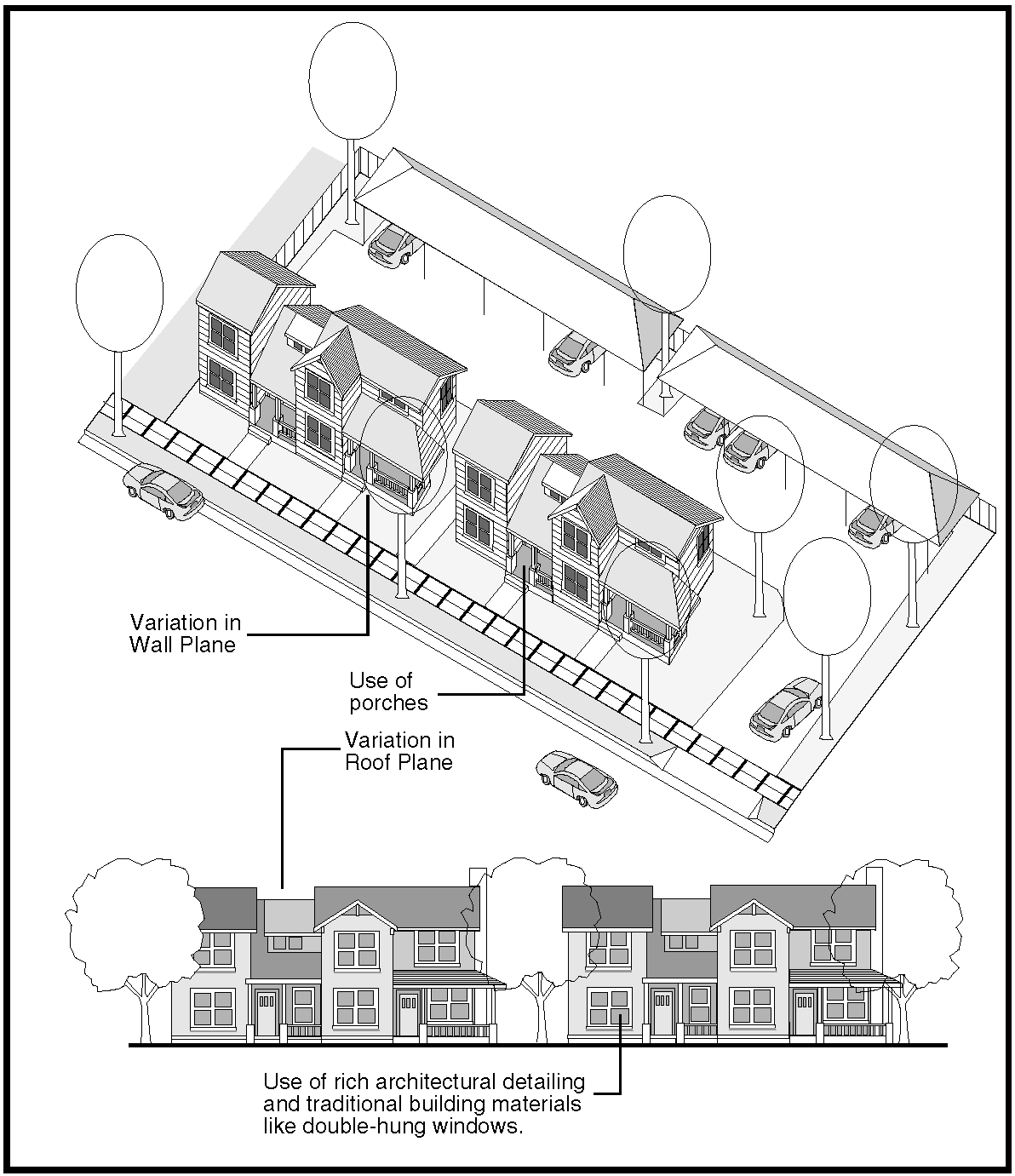 Long, unbroken building facades and box-like building forms should be discouraged. Building facades should be varied by alternating building planes, building material, color and building heights (see Figure 18-2). Other approaches to providing interesting multi-family structures could involve alternating the patterns of window and door opening; the use of projections such as balconies, porches and awnings; and changing setbacks and softening the building facade with tree plantings.
