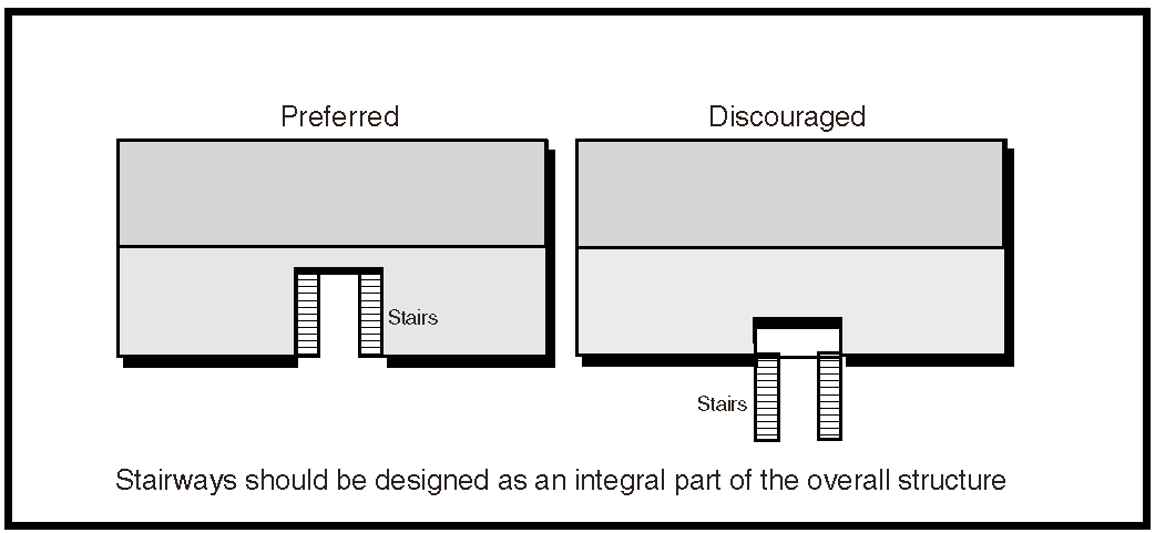Stairways should be designed as an integral part of the overall multi-family development. Materials used on the building should be incorporated into the stairway design (see Figure 18-3). Stairways should not be a dominant exterior feature on the building but should be sited so that they are not visually prominent.