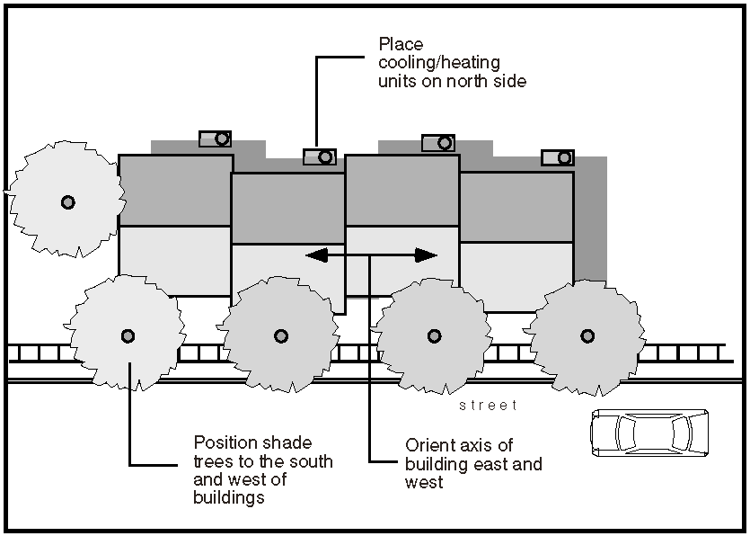 To the greatest extent possible, the multi-family buildings should run east and west to take advantage of passive solar design opportunities (see Figure 18-4).