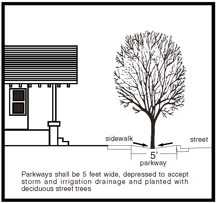 All parkways shall be five feet wide, shall be depressed and shall be provided with a drip irrigation line that runs from the multi-family development to the parkway (see Figure 18-5). Parkways will be planted with deciduous street trees. The parkway will be covered with mulch; turf will not be permitted.