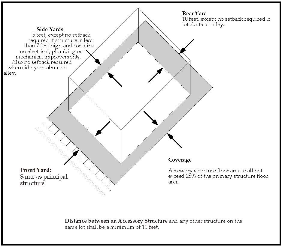 Interior side: Five feet (Zero feet if interior side yard adjoins an alley). If the accessory structure is less than seven feet in height and contains no electrical, plumbing or mechanical improvements, the side yard setback may be reduced to zero feet.