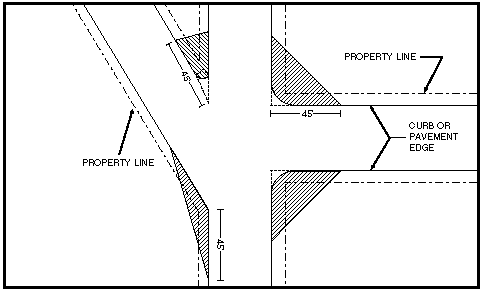 "Traffic safety sight area" (see Exhibit 72-3 for illustration) means that portion of both public and private property located at any corner and bounded by the curb line or edge of roadway of the intersecting streets and a line joining points on the curb or edge of roadway forty-five (45) feet from the point of intersection of the extended curb lines or edges of roadway.