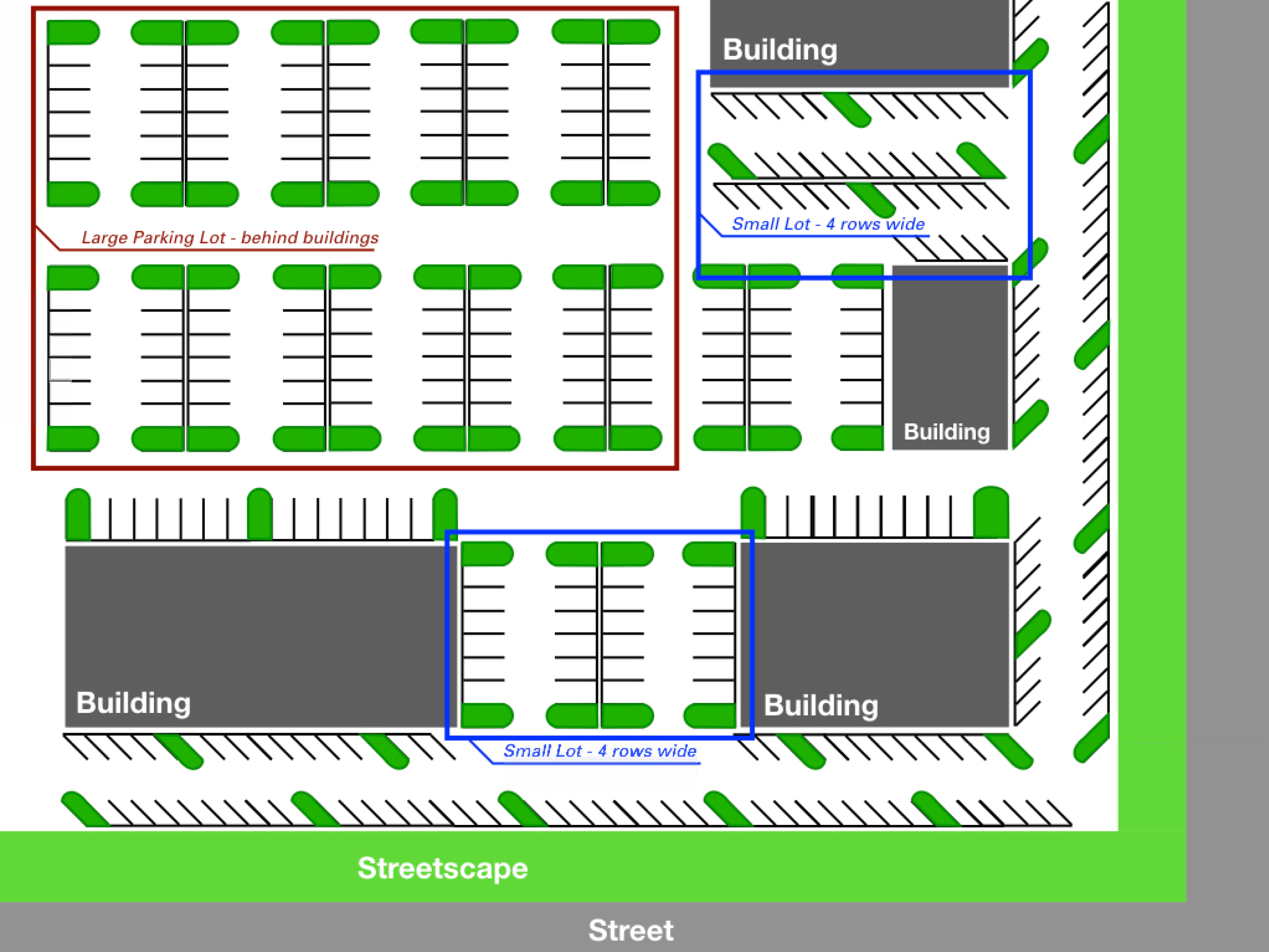 Parking areas shall be distributed around the site, rather than being concentrated in large lots, unless these lots are screened from the public right-of-way by buildings. A maximum of two (2) rows of parking may be located between the primary structure and any streets. Smaller parking lots containing no more than four (4) rows or parking spaces are permitted to be located to the side of buildings, and larger lots are permitted to be located behind buildings, generally as shown in the figure below.