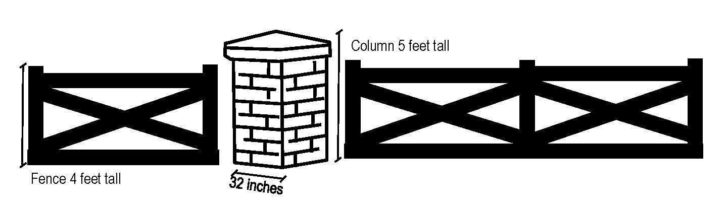 Brick/Stone Piers—Every one hundred (100) feet on center (o.c.) with the decorative fence in between, as depicted below. The decorative fence shall be composed of pressure treated wood or composite material of a similar appearance: Six inch by six inch by four foot (6" x 6" x 4') post, set seven (7) feet on center; top and bottom horizontal rails and diagonal rails; five-fourths inch by six inch (5/4" x 6") fascia board painted black or dark brown.