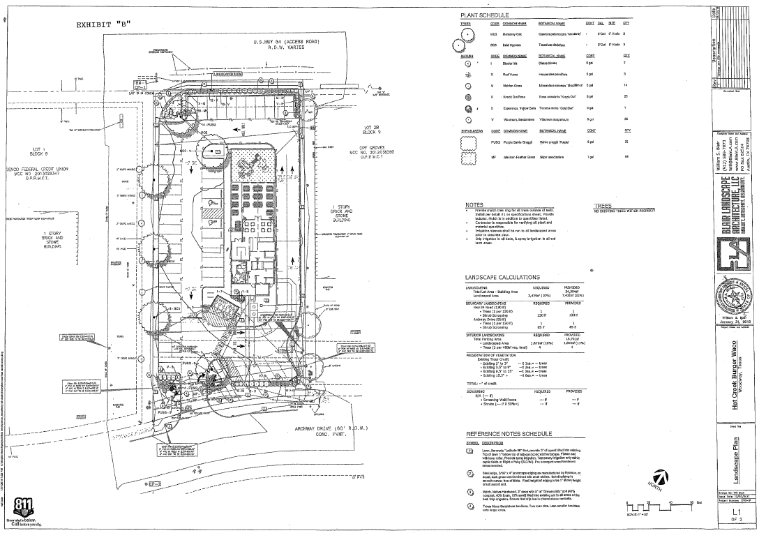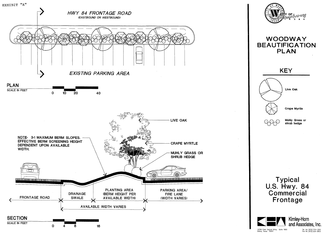 Boundary Landscaping: In all non-single-family dwelling districts, boundary landscaping shall be provided along the abutting public rights-of-way (except an alley) of each lot. The intent of this landscaping is to screen the parking lots of non-single-family dwellings from the abutting rights-of-way. Such landscaping shall consist of a combination of grass/turf, groundcovers and vines, shrubs, evergreen trees, canopy/shade trees, ornamental trees, perennials, and annuals; provided, that they will not obstruct sight distances or vehicular or pedestrian circulation. Canopy trees may not be planted in utility easements with overhead utilities. All lots abutting U.S. Hwy. 84 right-of-way shall provide boundary landscaping as illustrated for example purposes in Exhibit A, which shall include a combination of berms and plant materials as illustrated for example purposes in Exhibit B*. No specific spacing shall be required for boundary landscaping provided that the landscaping is appropriate to plant growth habits and the character of the site; however, approved canopy/shade trees must be provided at a minimum of one (1) tree per each one hundred fifty (150) feet of frontage or every fraction thereof. Boundary landscaping inside lots, but not including any public right-of-way, shall count toward total minimum landscaping percentage required. Additional landscaping on public right-of-way may be approved for installation on a case by case basis with such approval to be in writing from the city.