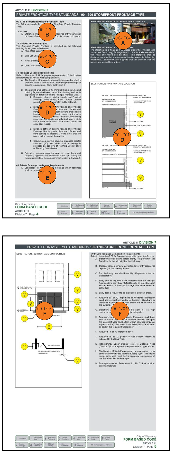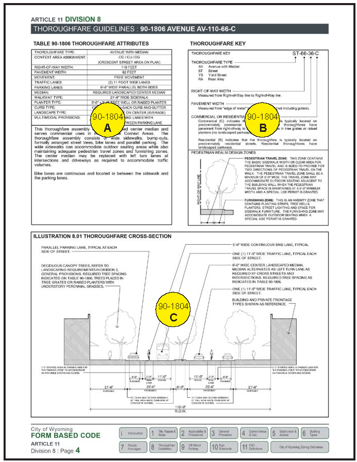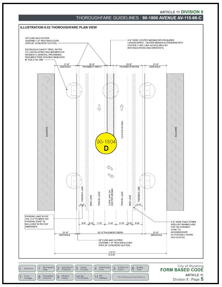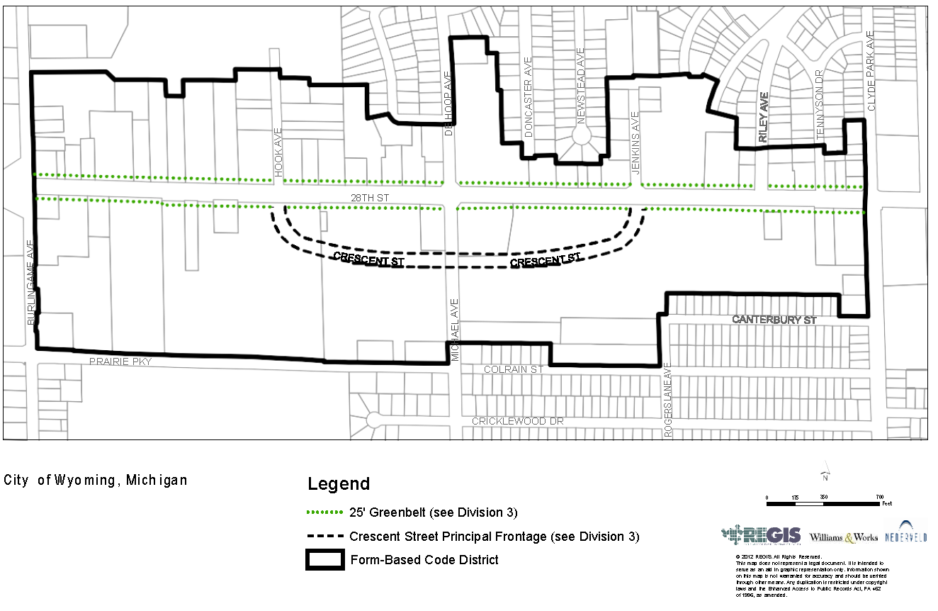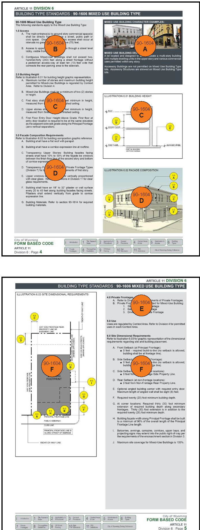 The City of Wyoming Form Based Code is a legal document regulating building types and frontage types, and guidelines for thoroughfare types wherever its Context Areas are applied. It shall do so in conjunction with the municipal Zoning Ordinance for areas zoned Form Based Code (FBC) on the zoning map, by regulating land development to ensure a compact, urban form.