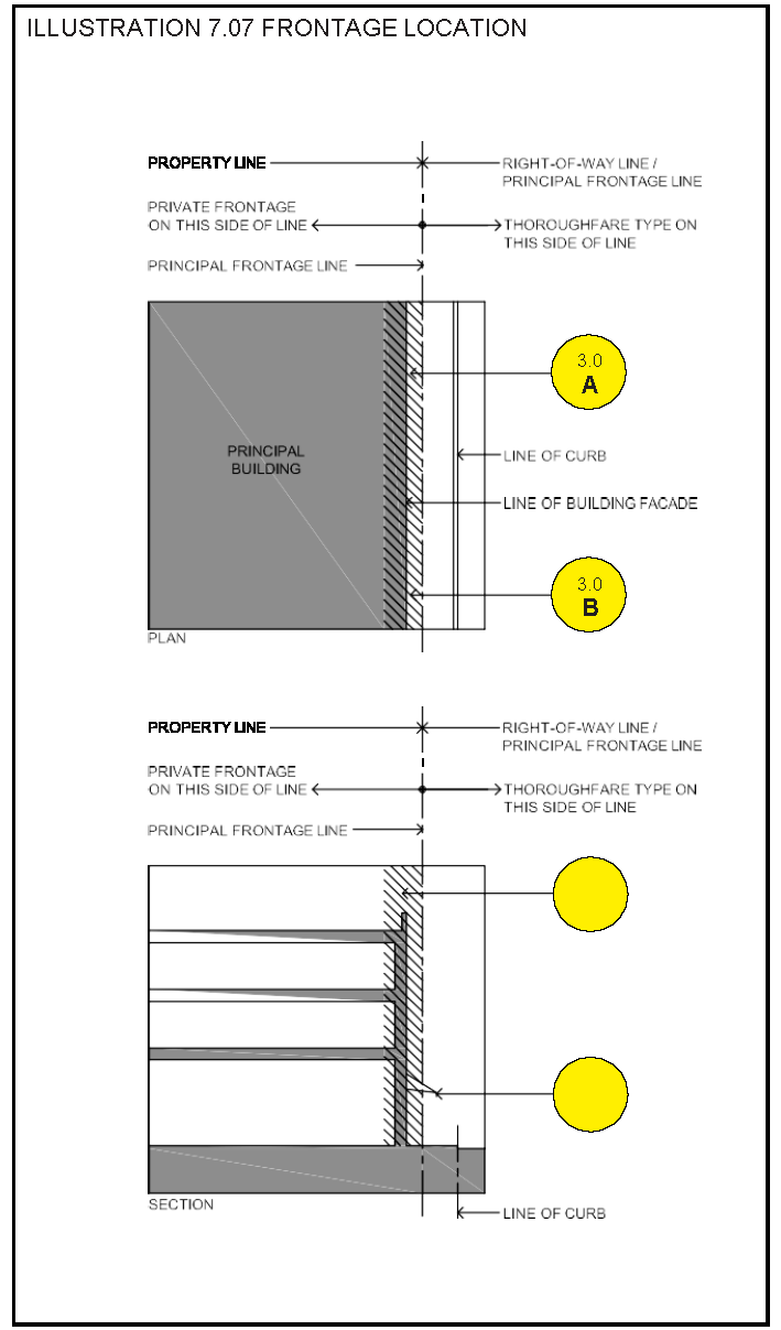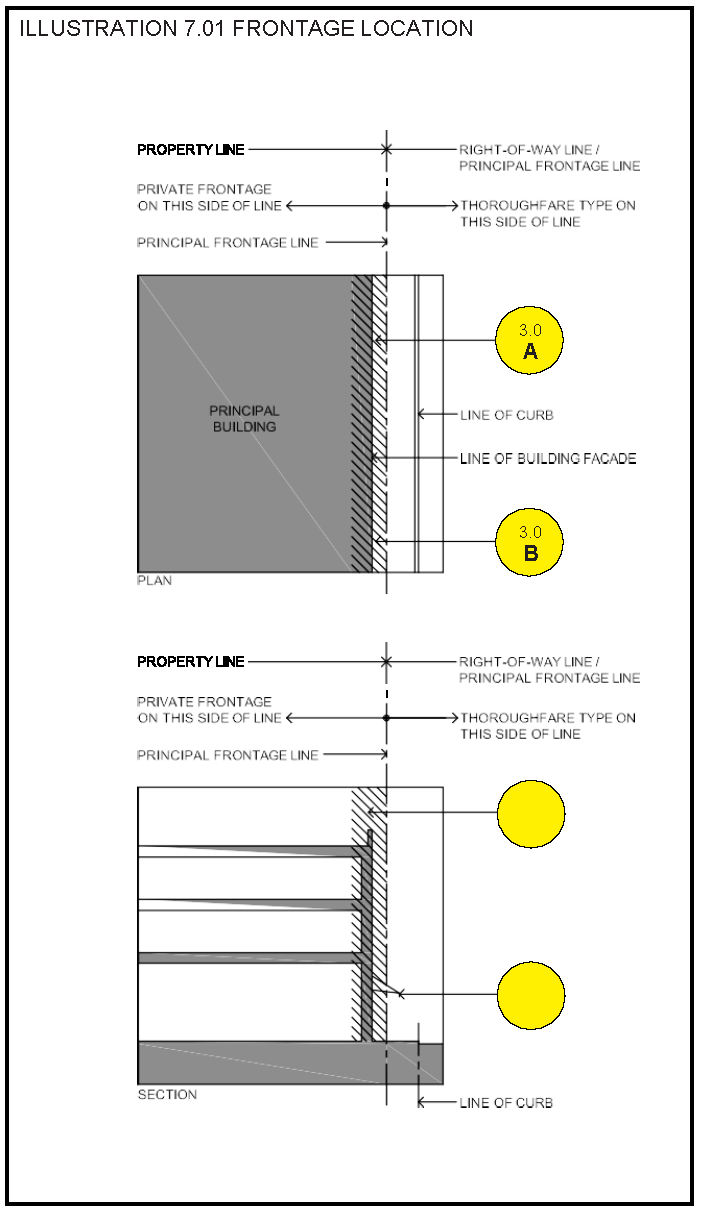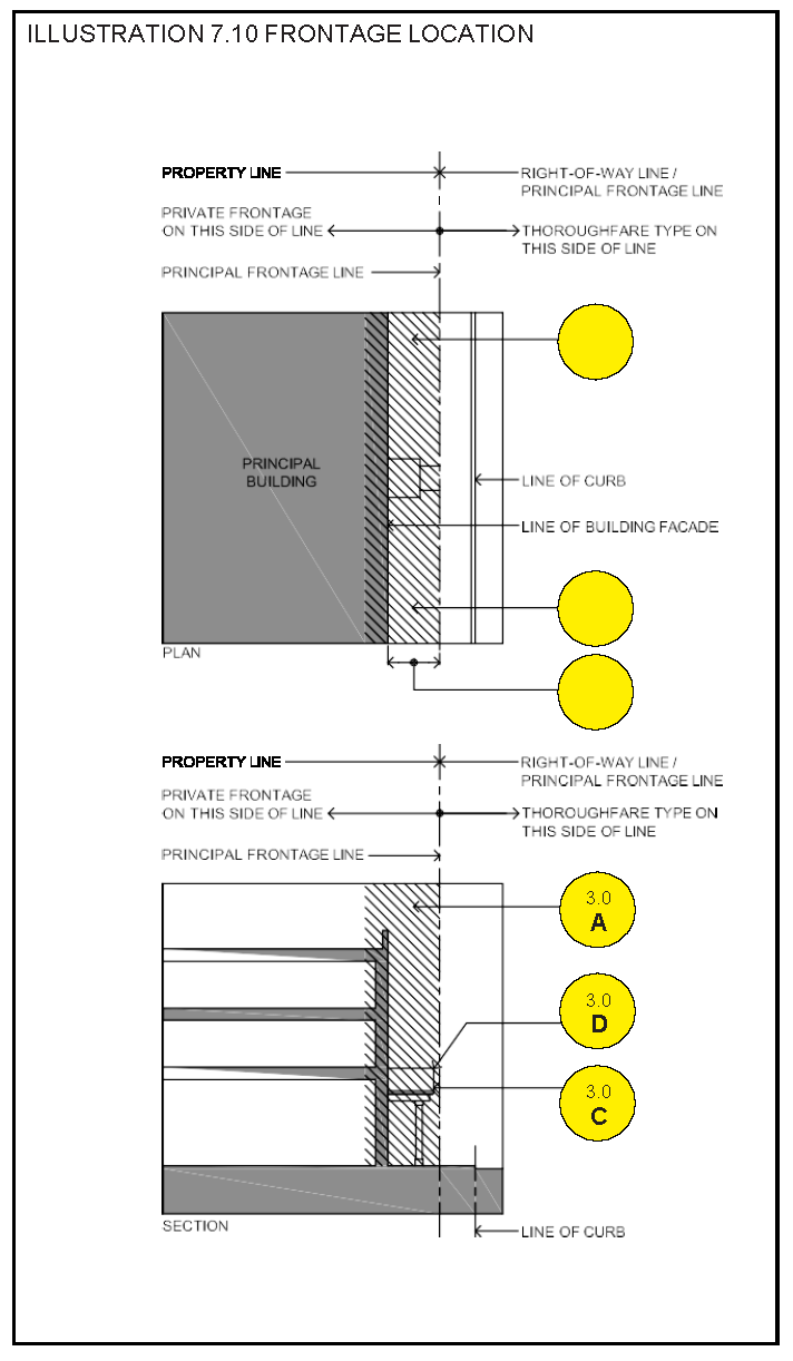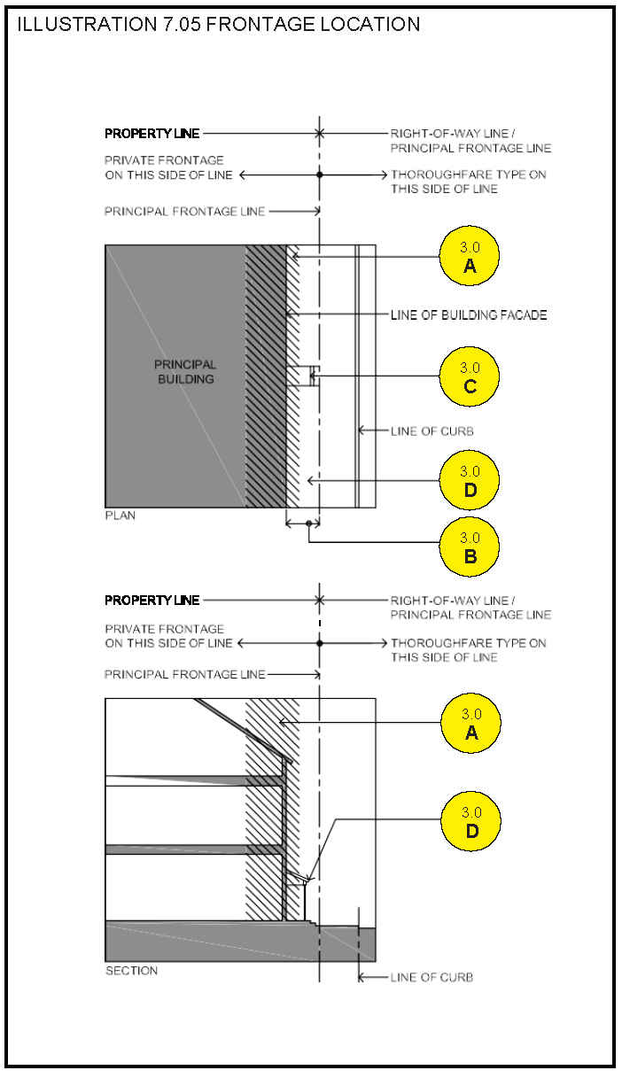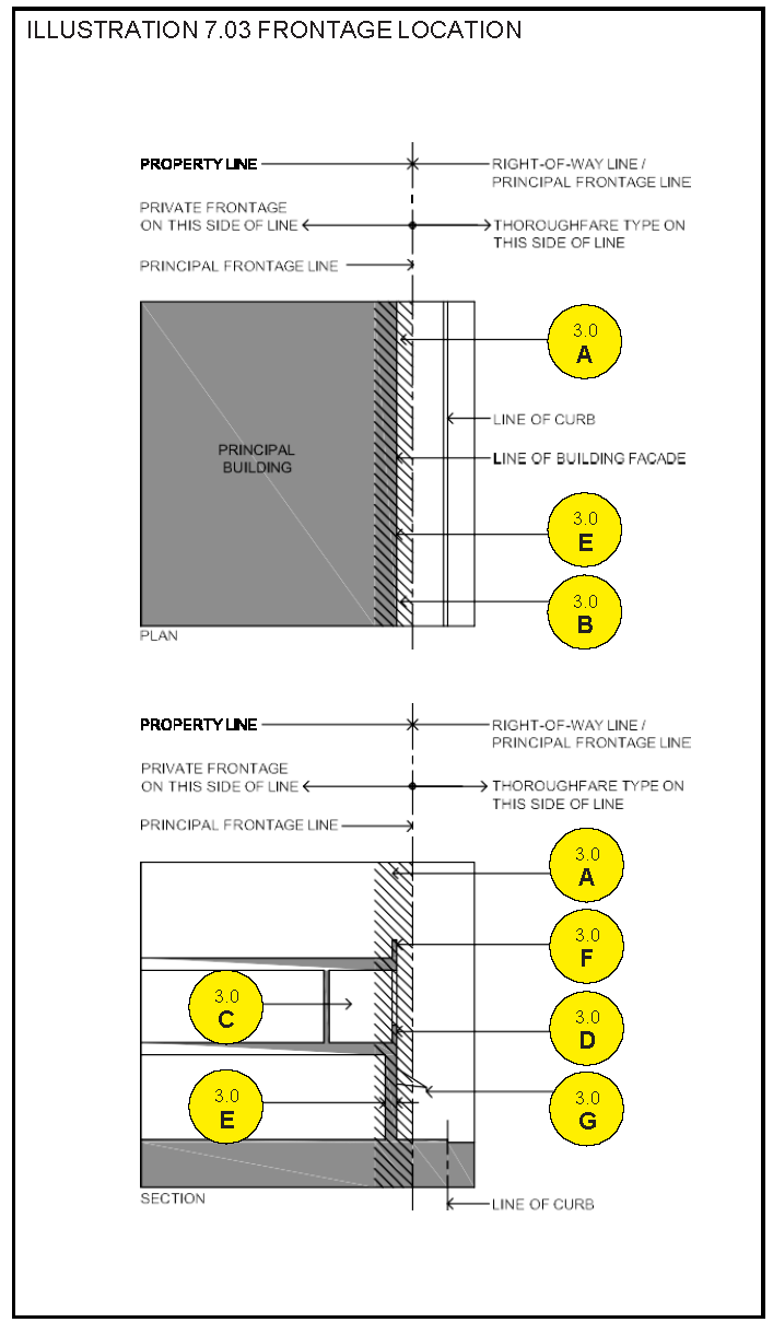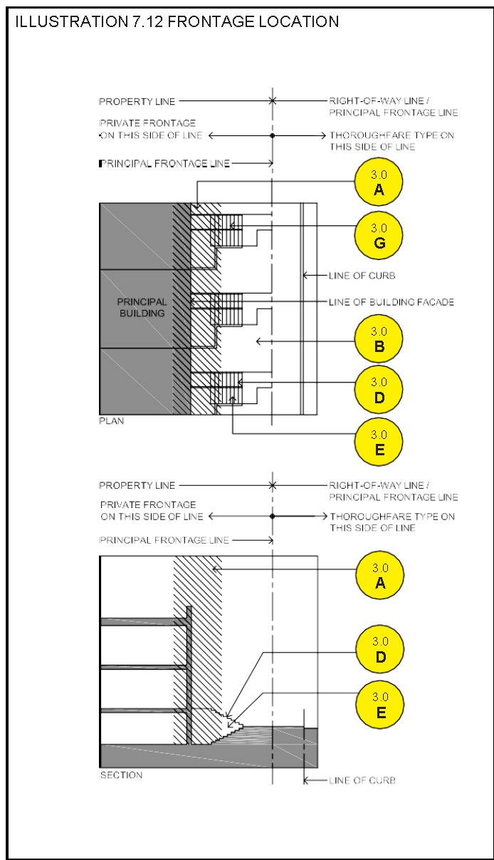 Private frontage type: The privately owned area between the frontage line and the building façade. Private frontage types are applied to building types to ensure that the building adequately engages the street frontage and public realm. Private frontages are regulated in division 6 and are assigned to building types in division 7.