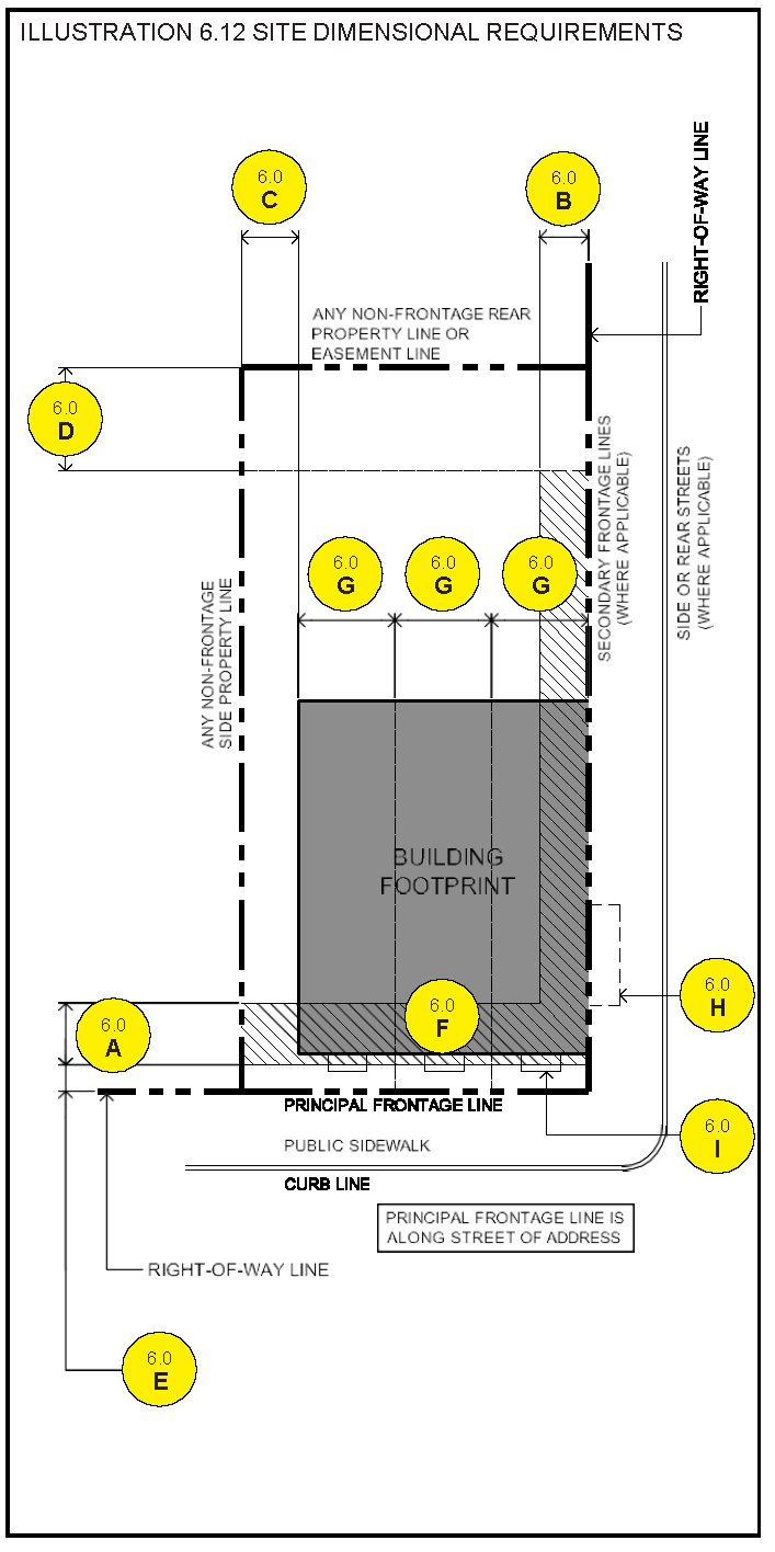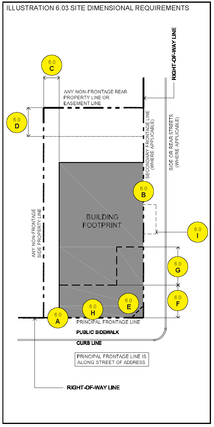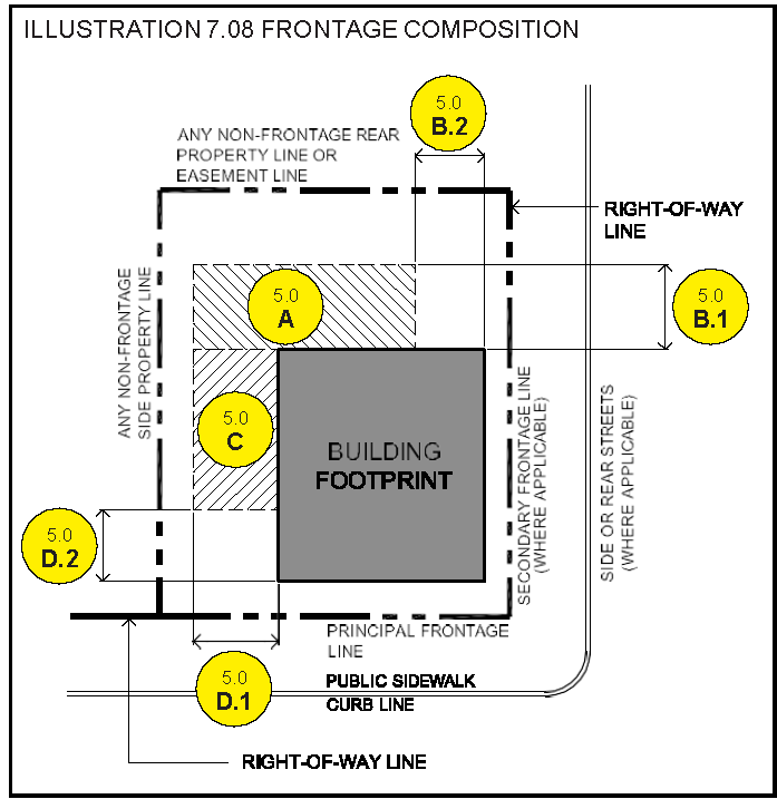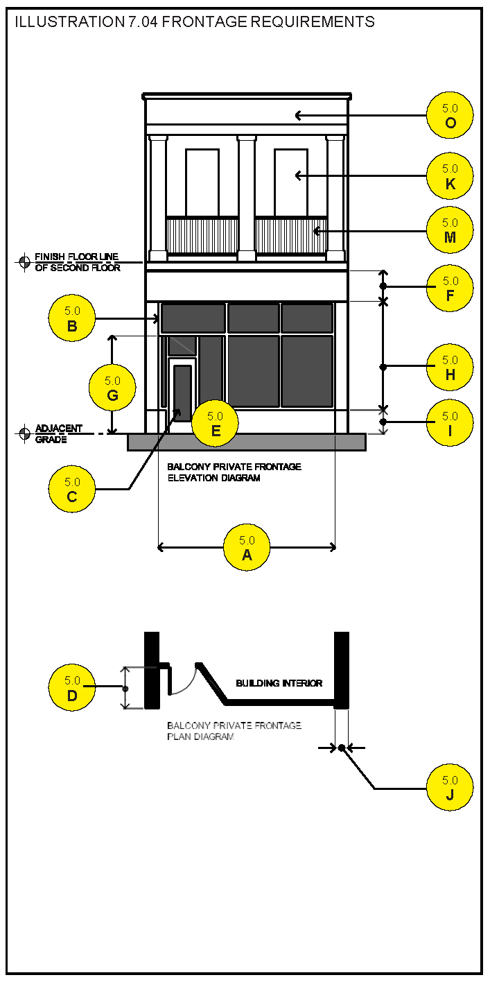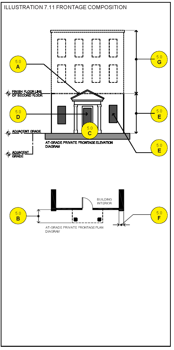 Private frontage type: The privately owned area between the frontage line and the building façade. Private frontage types are applied to building types to ensure that the building adequately engages the street frontage and public realm. Private frontages are regulated in division 6 and are assigned to building types in division 7.