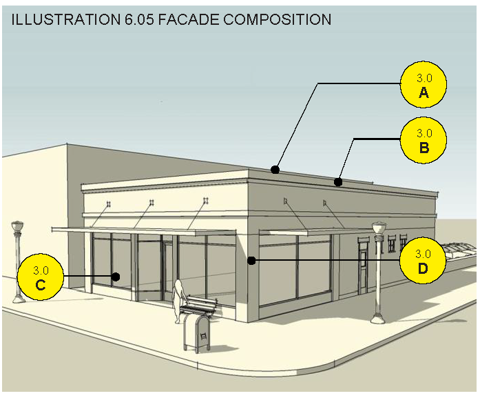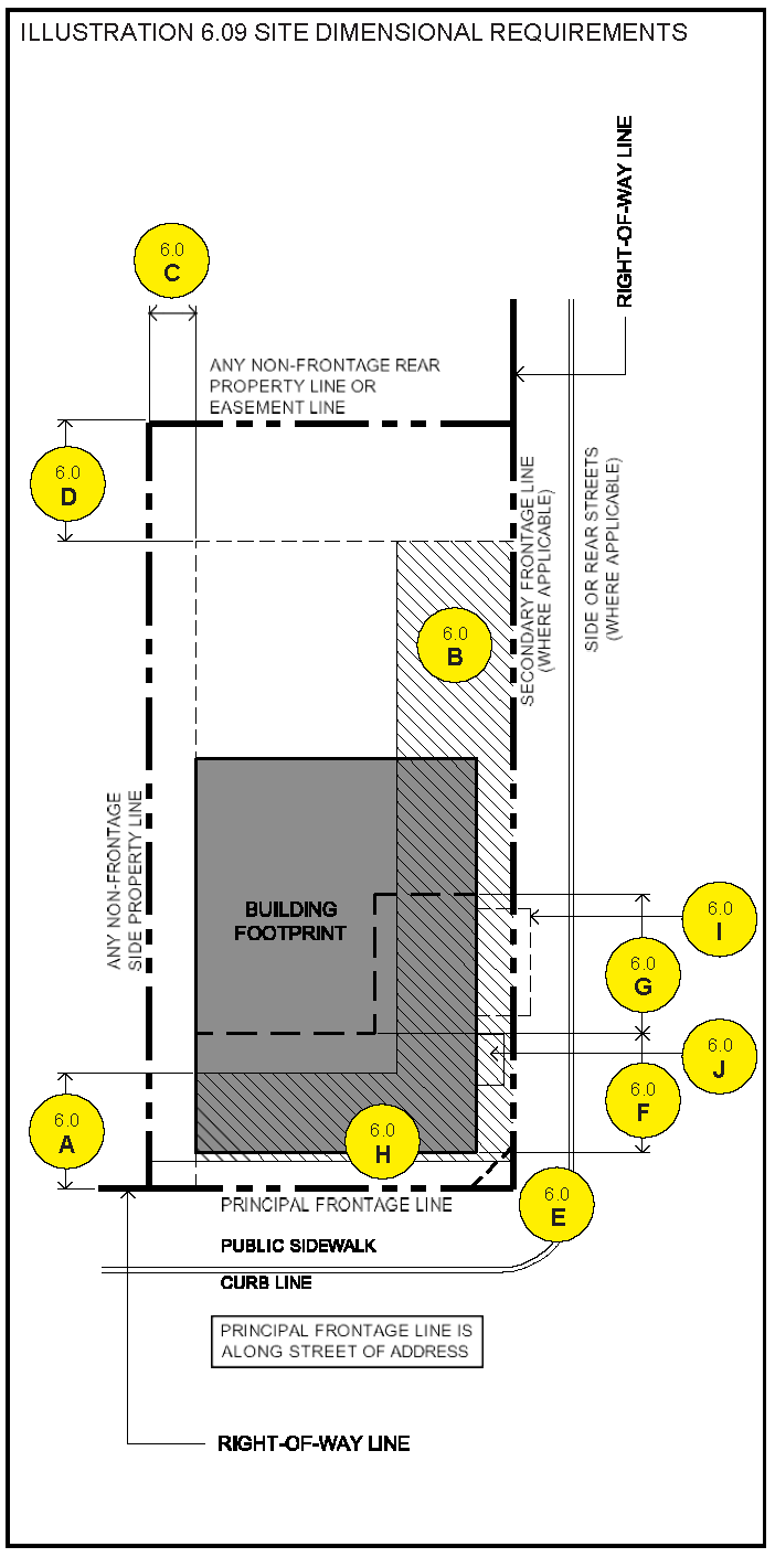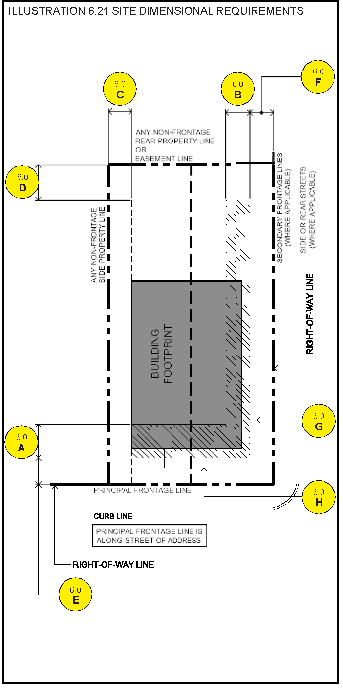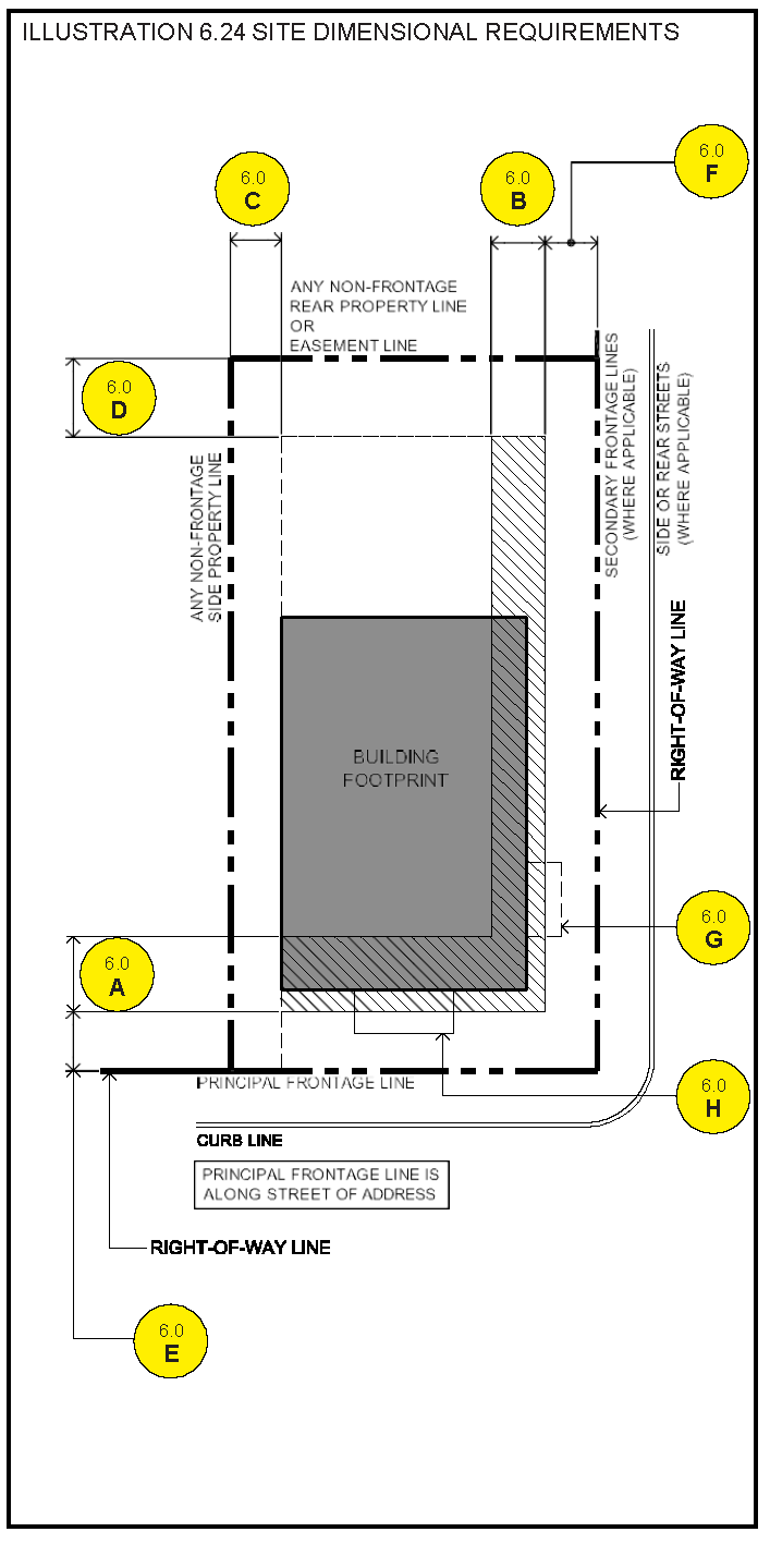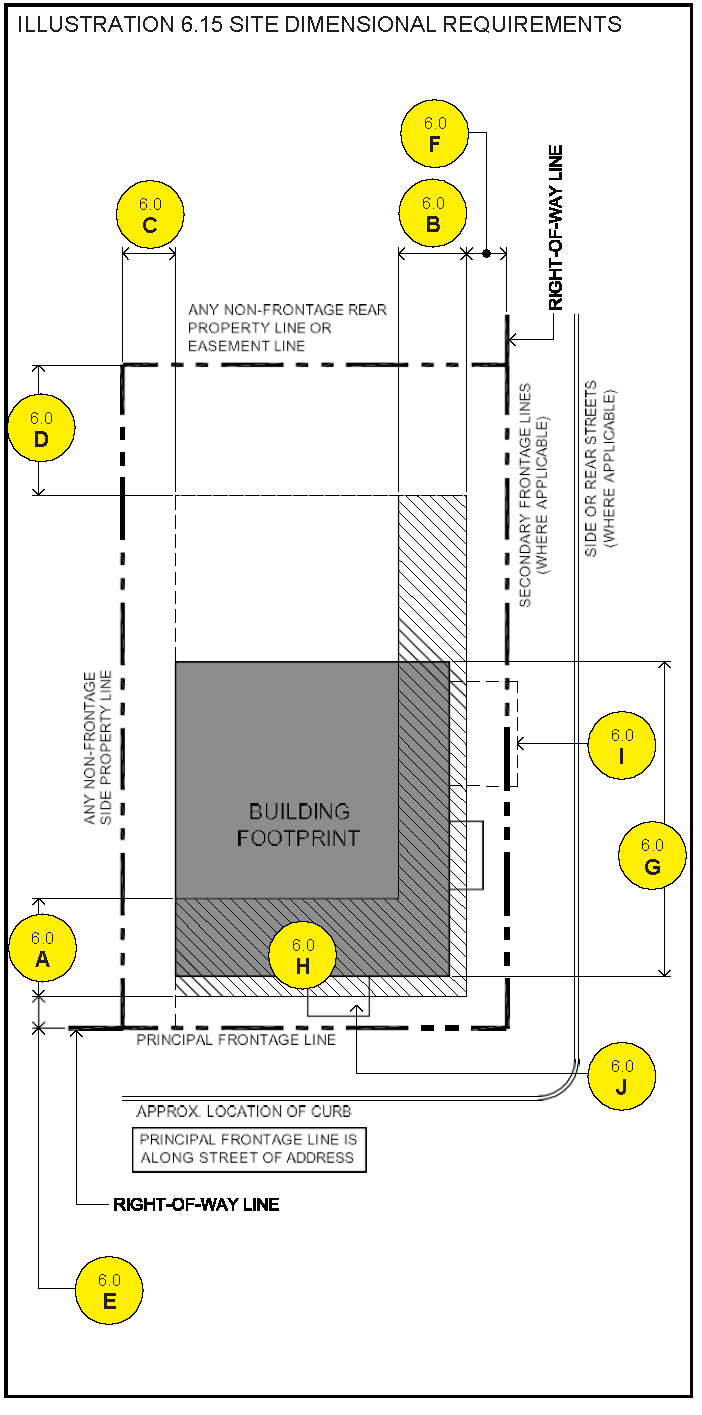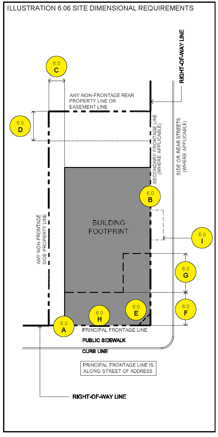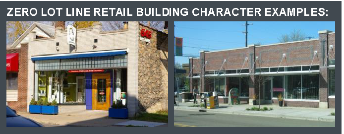 Zero lot line retail building type: A lot located and designed to accommodate a single-story building with various commercial uses permitted at the ground floor level. Building site placement is required to have no setback at the principal frontage line.