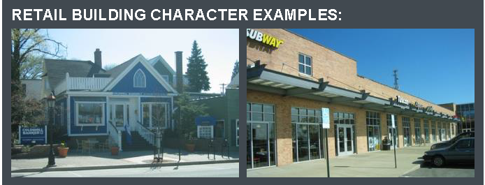 Retail building type: A lot located and designed to accommodate a single-story building with various commercial uses permitted at the ground floor level. Building site placement has a variable build-to-zone at the Principal Frontage Line.