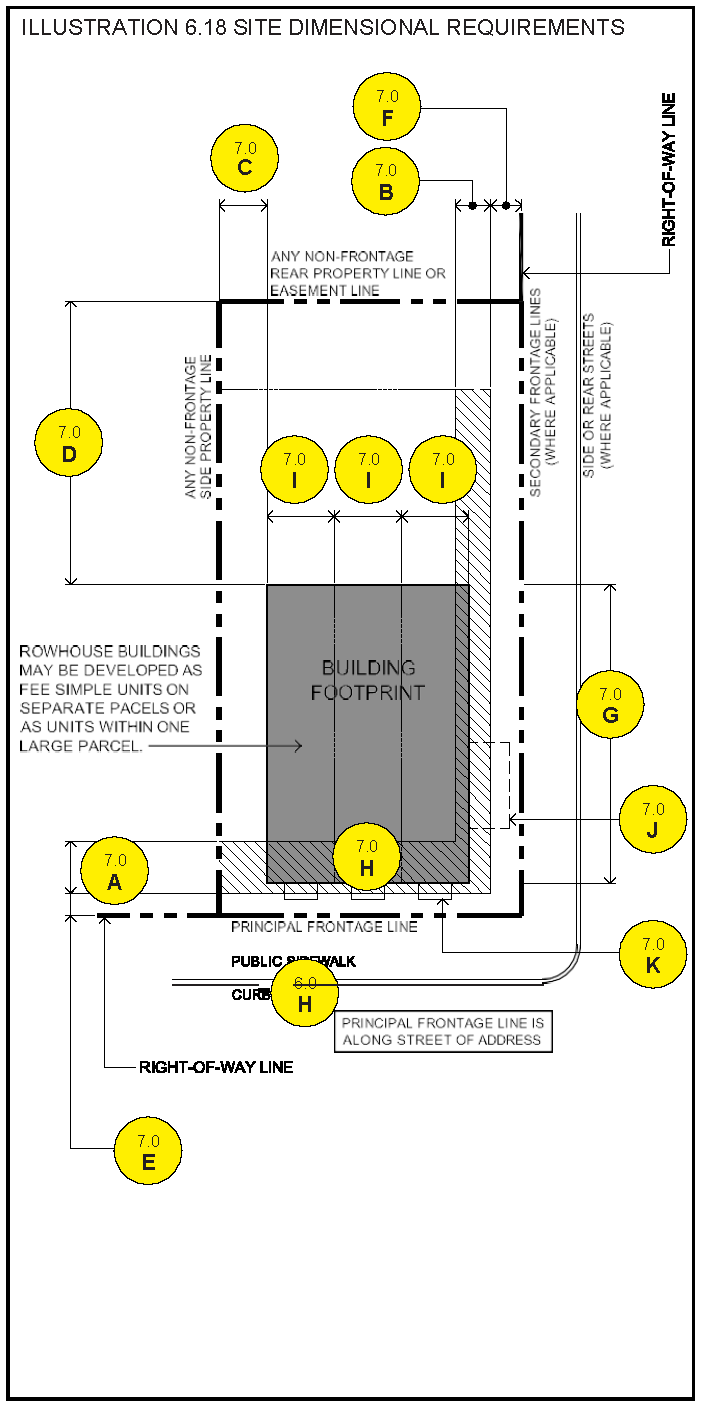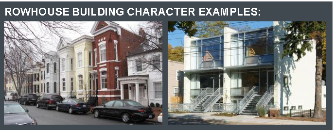 Rowhouse building type: A lot located and designed to accommodate a principal building with common walls on both side lot lines and a private yard to the rear.