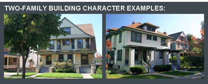 Two-family house building type: A lot located and designed to accommodate a two-family building with front, rear and side yards.