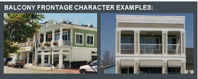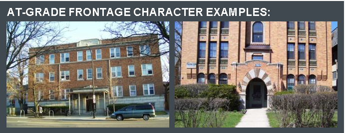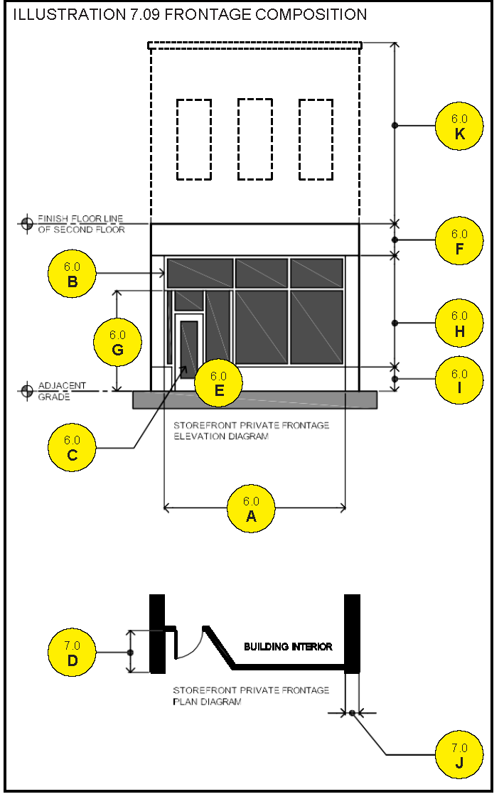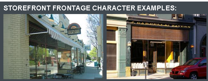 Storefront private frontage: The storefront is a frontage type placed along the principal (and sometimes secondary) frontage line(s). It is typically associated with retail and mixed use buildings. The storefront is designed in a way that promotes an attractive, convenient shopping experience. Storefronts are at grade with the sidewalk and are sometimes shaded by awnings.
