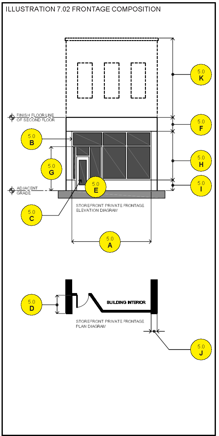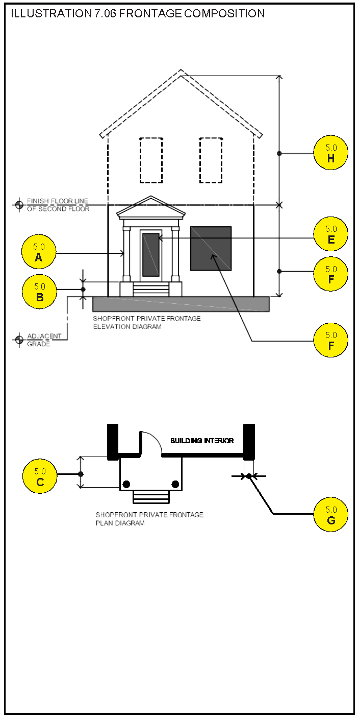 Shopfront private frontage: The shopfront is a frontage type placed along the principal frontage line in a build- to-zone. It is typically associated with retail uses at the first story in context areas that have a less intense (more residentially scaled) retail environment. The shopfront is designed in a way that promotes an attractive, convenient shopping experience. Storefronts may be elevated above the adjacent grade.
