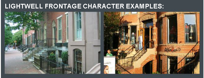 Lightwell private frontage: The lightwell is a frontage type placed along the Principal Frontage line in a build- to-zone. It has separate stairs that connect a lower level entrance (lightwell) and an upper level entrance (terrace) to the public sidewalk. This allows direct access to the first story and a partially exposed basement. Commonly used on attached buildings, this frontage may also provide outdoor seating opportunities at both the terrace and lightwell locations.