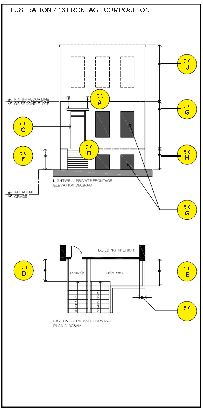Lightwell: A component of the lightwell private frontage that is recessed below the adjacent grade in order to provide a landing and access to the basement from the sidewalk. Typically used in association with a terrace. Refer to terrace definition.