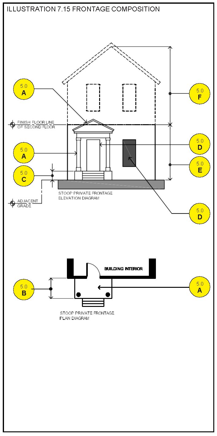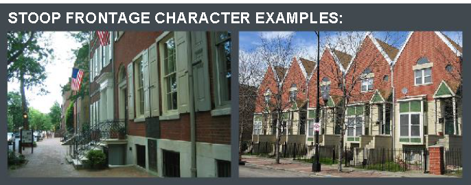 Stoop private frontage: The stoop is a frontage type typically placed along the principal frontage line, although it may also be placed in the side yard. A stoop is a small staircase leading to the entrance of a building that has a roof at the entrance. The elevation of the stoop is required to achieve privacy for residential uses on the first story.