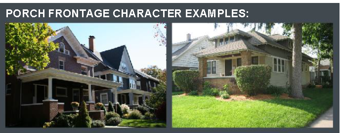 Principal frontage line(s) within a build-to-zone: porches are open-air structures that are attached to the principal building, forming a covered entrance. Porch dimensions need to be such that sufficient space for furniture is provided, allowing comfortable use of the space.