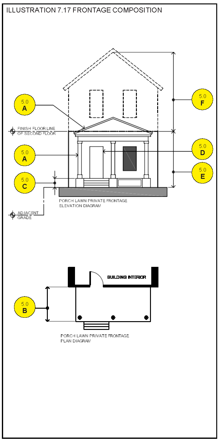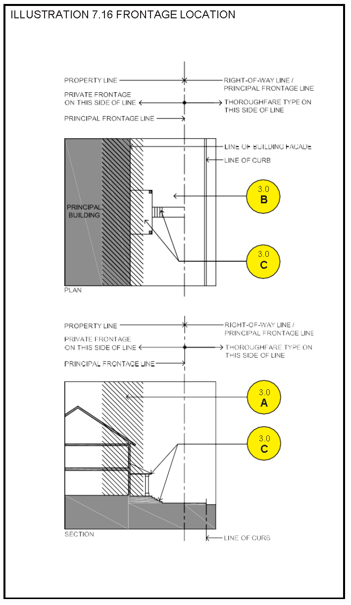 Porch private frontage: The porch is a frontage type placed along the Principal frontage line(s) within a build-to-zone. Porches are open-air structures that are attached to the principal building, forming a covered entrance. porch dimensions need to be such that sufficient space for furniture is provided, allowing comfortable use of the space.