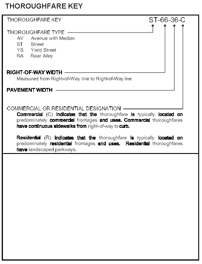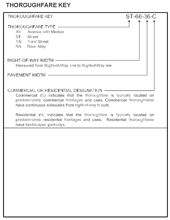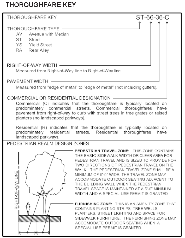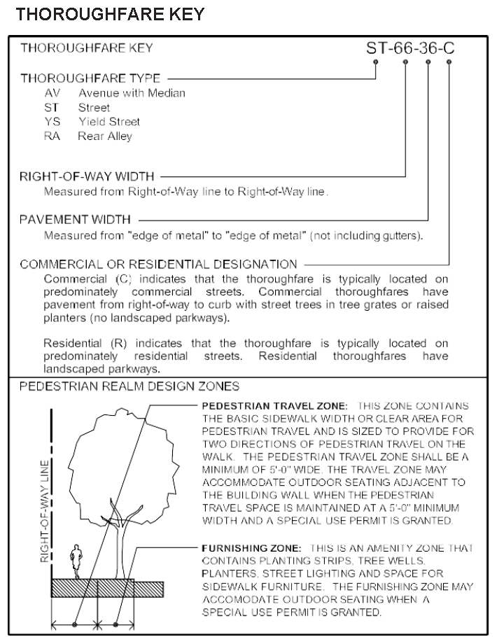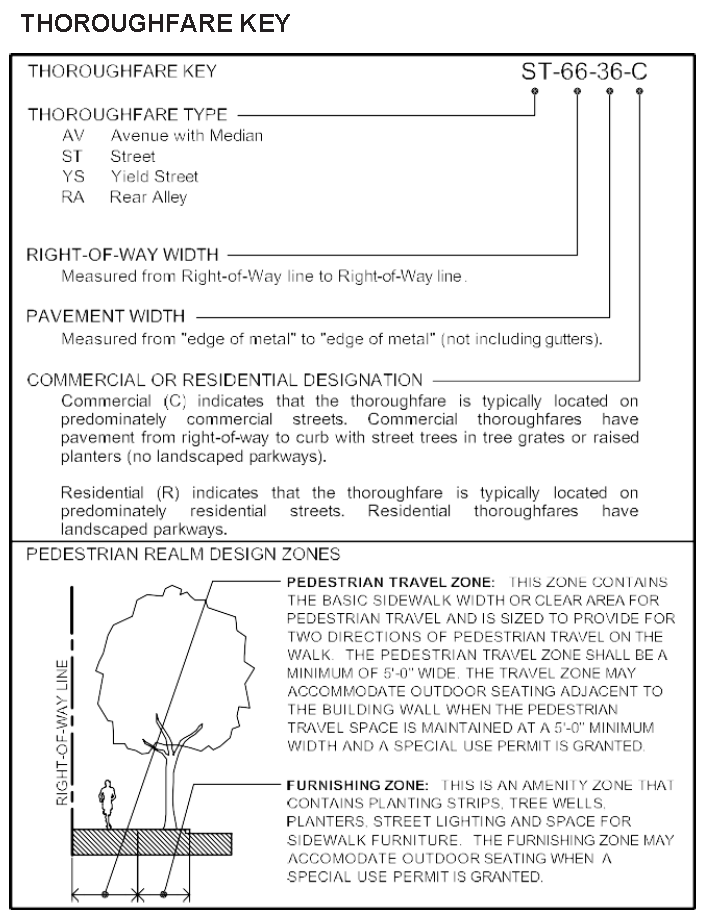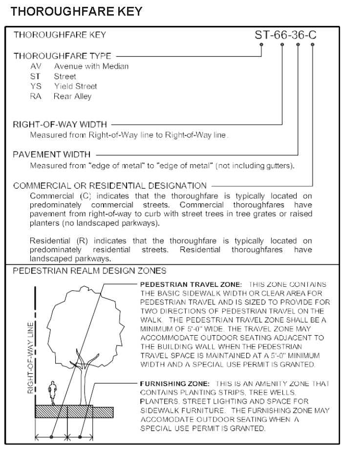 Thoroughfare type: Thoroughfare Types describe the space within the public realm, between the right-of-way lines. They include the sidewalk, parkway, furnishing zones, curbs, parking lanes and travel lanes of streets, roads, and alleys.