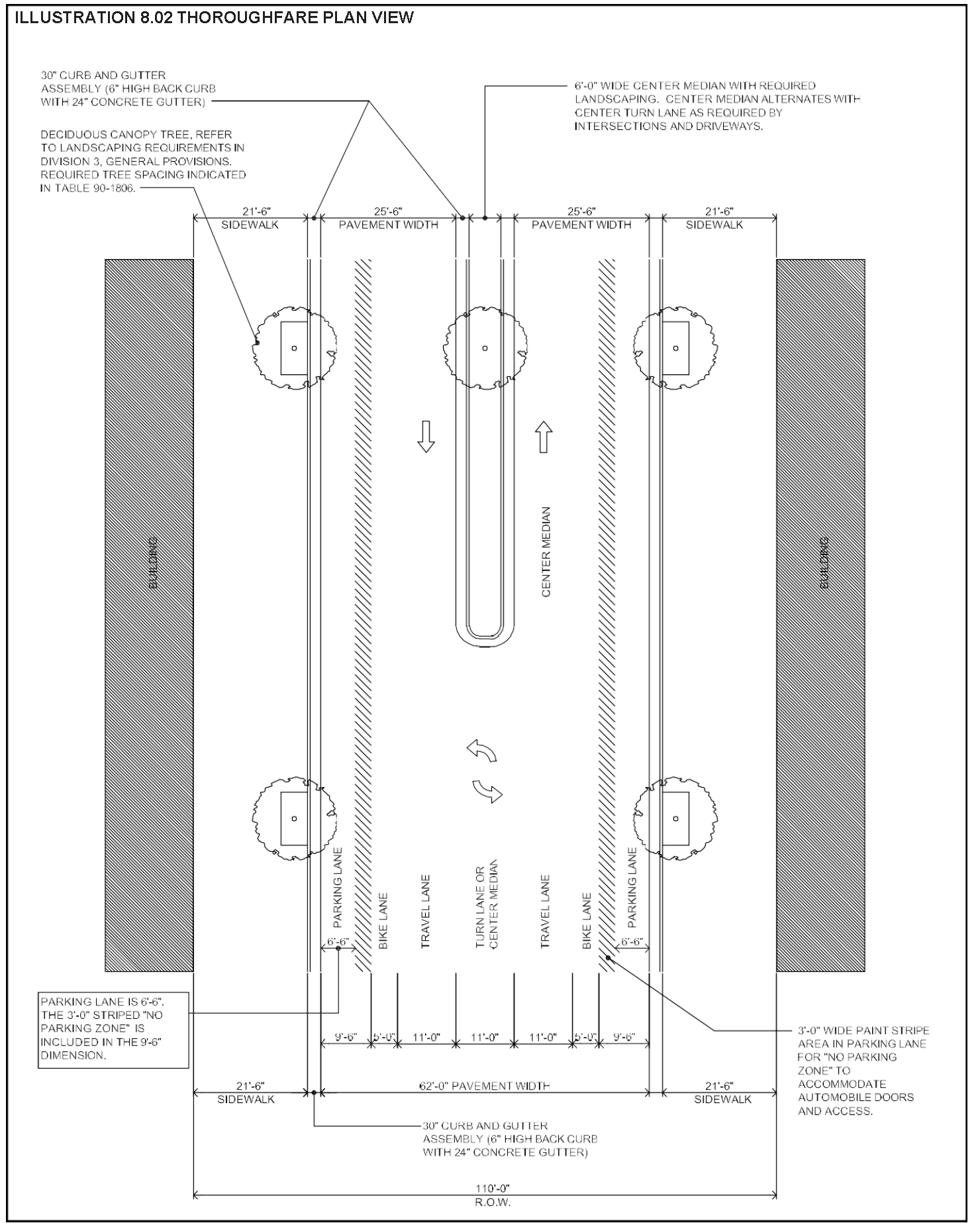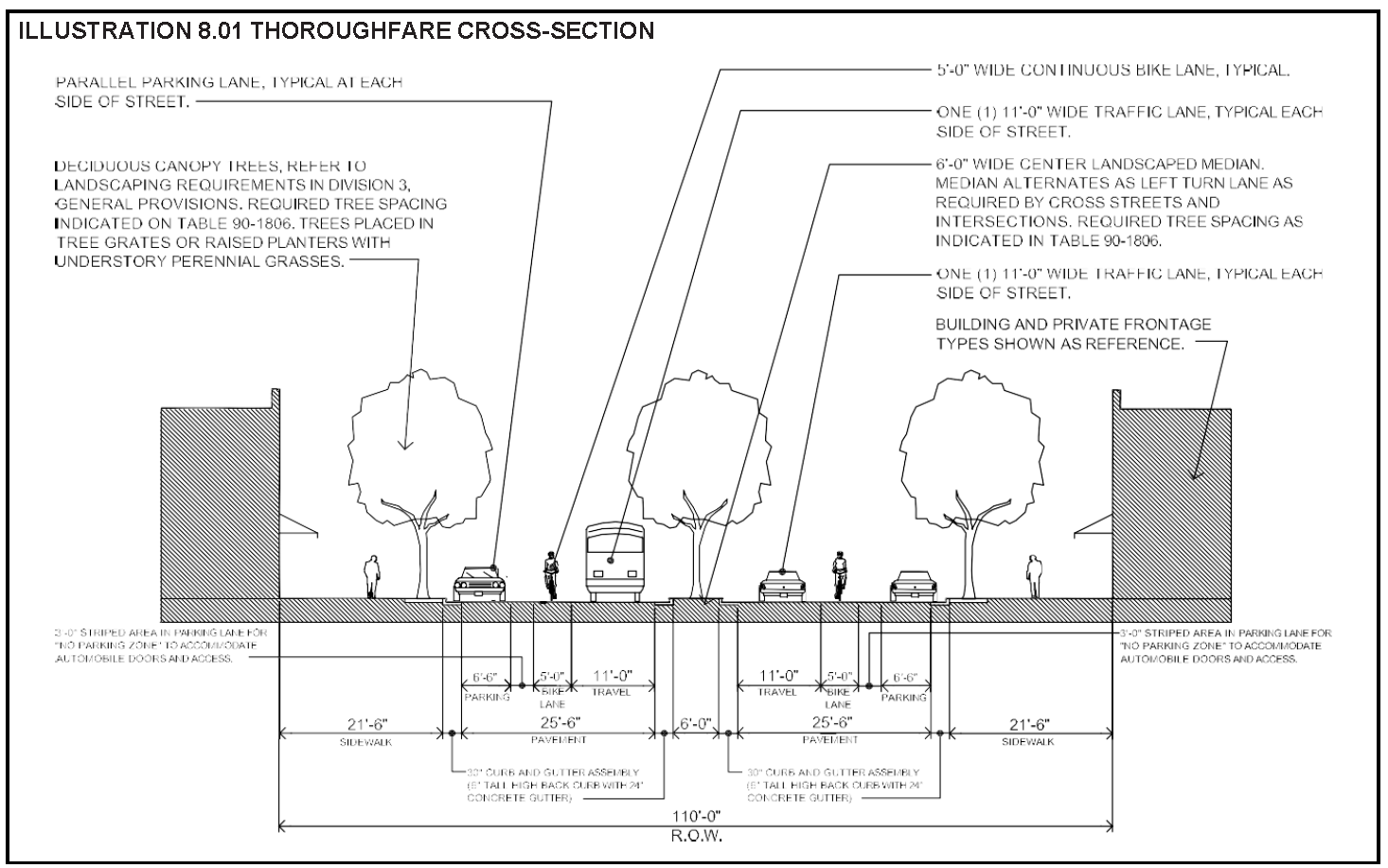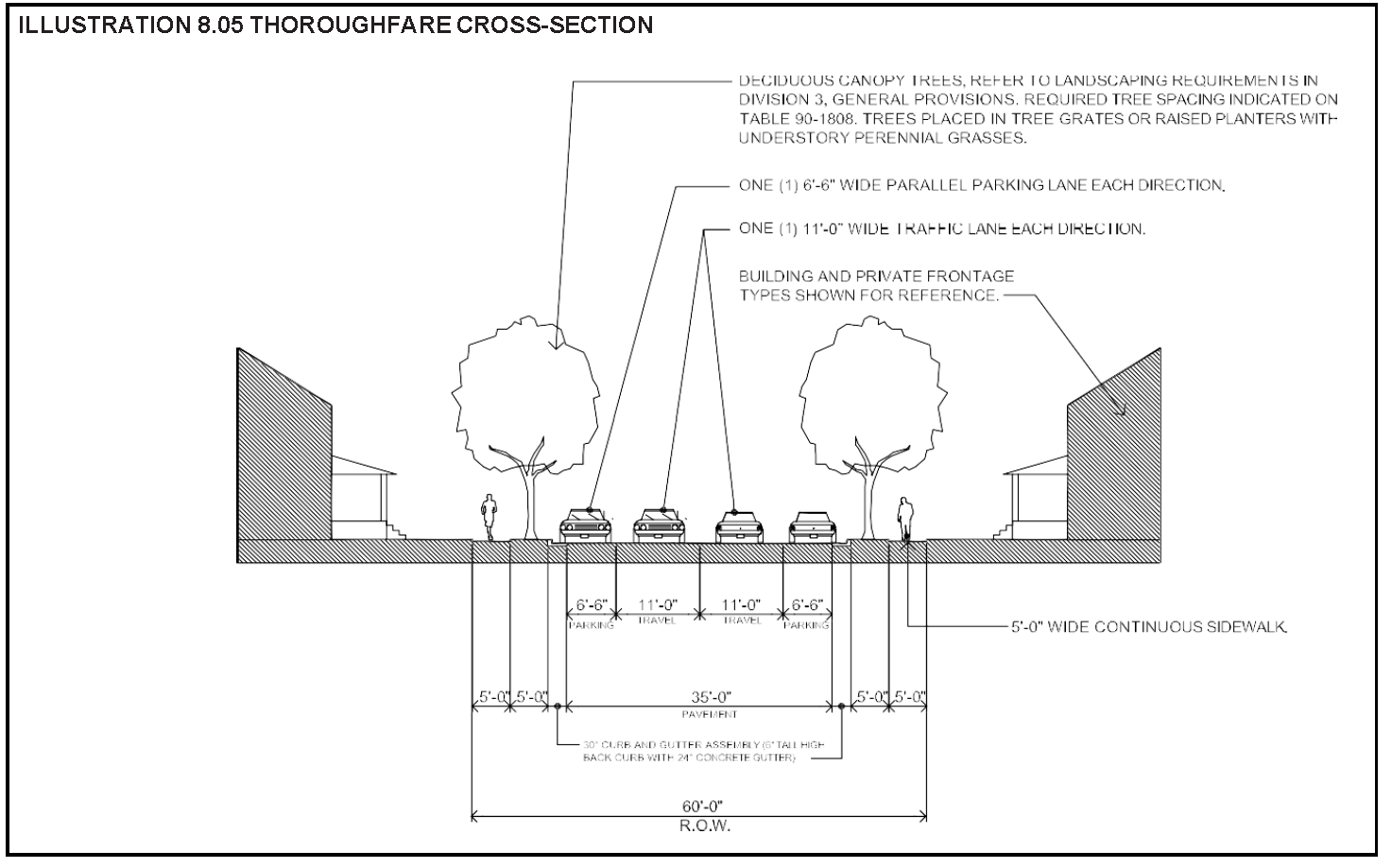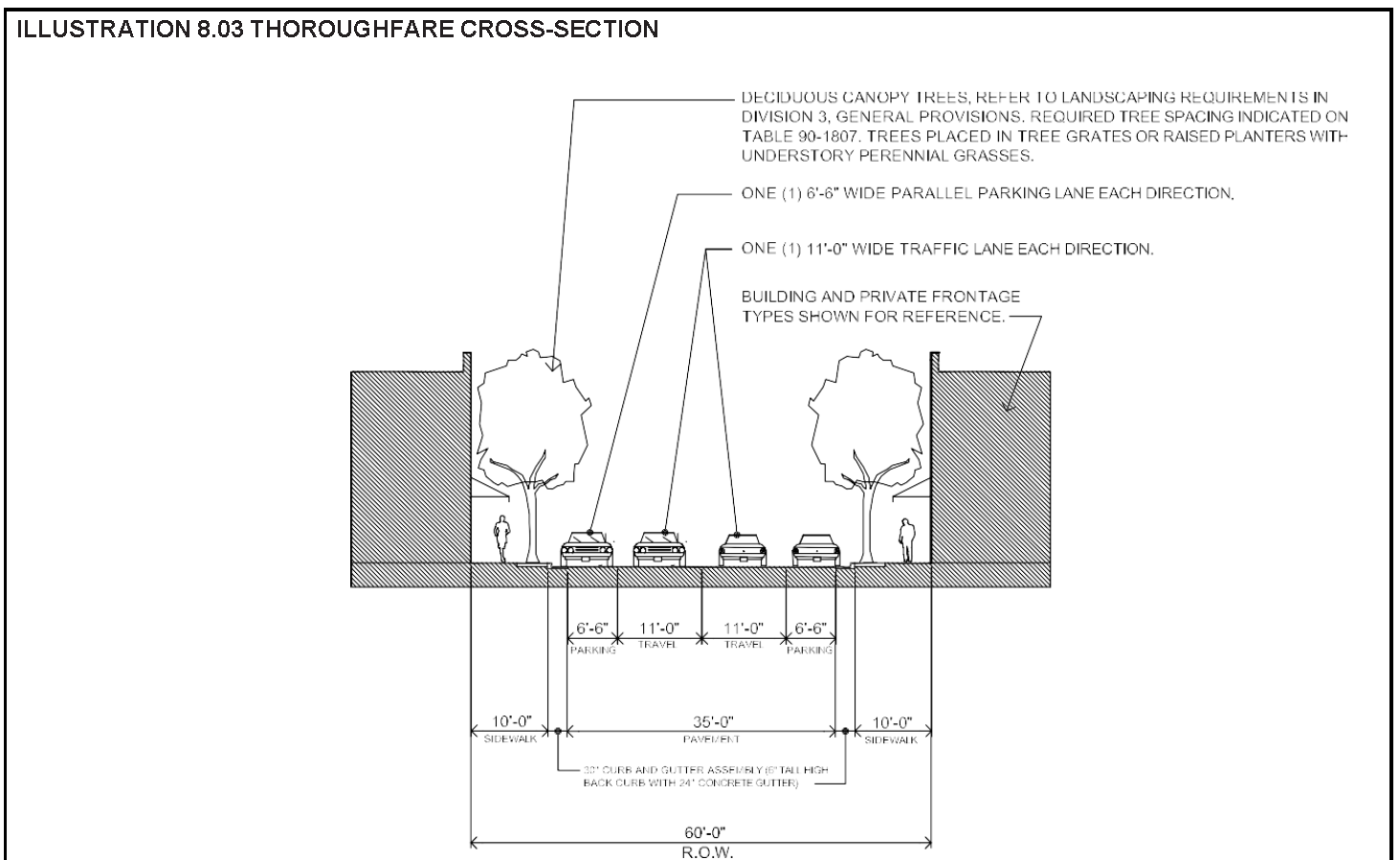 Thoroughfare type: Thoroughfare Types describe the space within the public realm, between the right-of-way lines. They include the sidewalk, parkway, furnishing zones, curbs, parking lanes and travel lanes of streets, roads, and alleys.