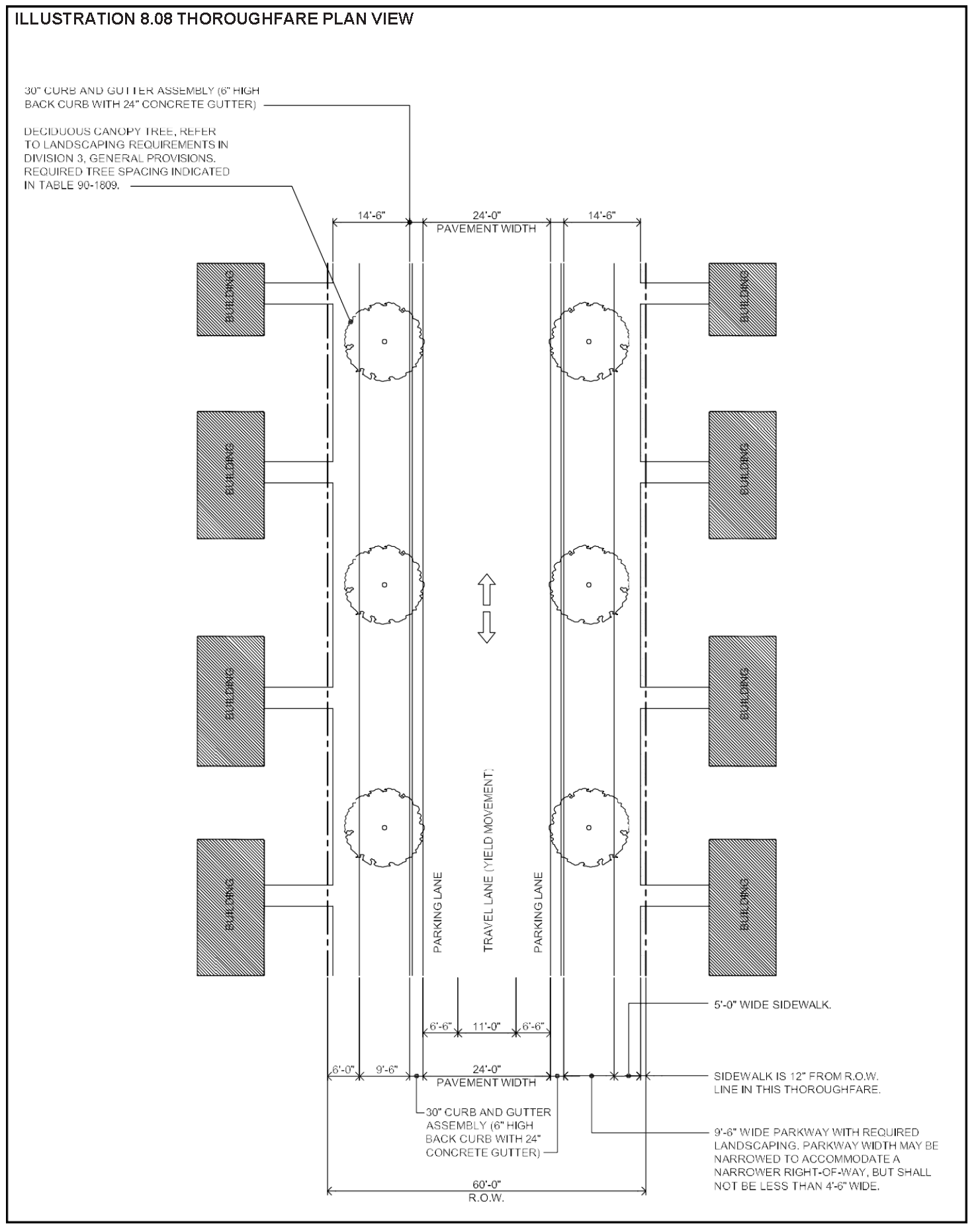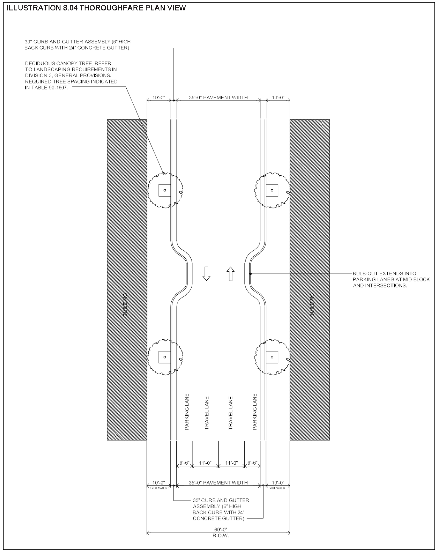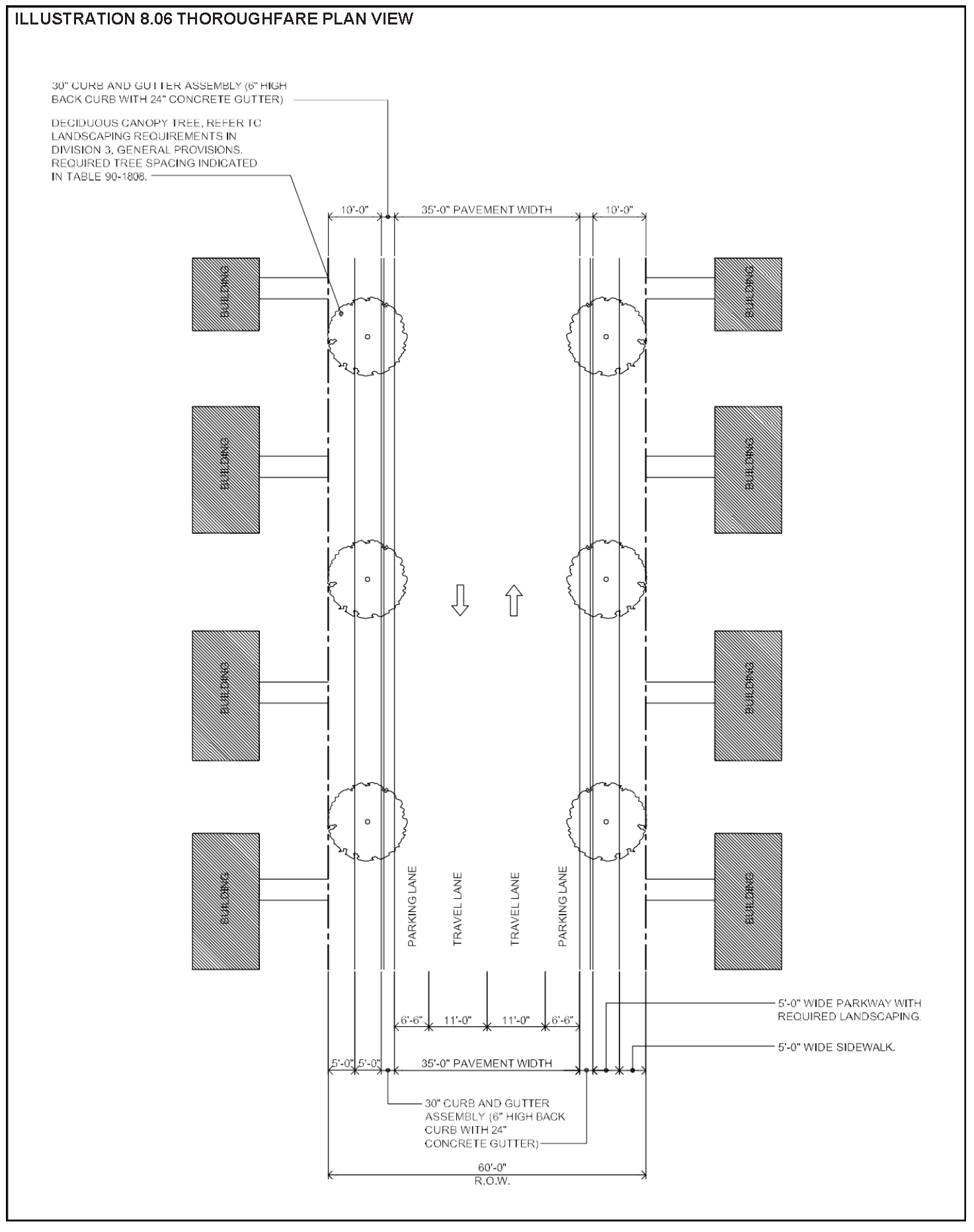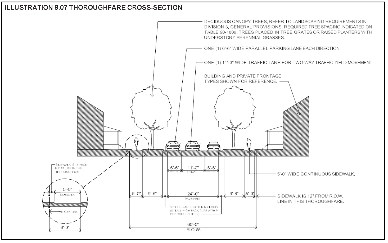Thoroughfare type: Thoroughfare Types describe the space within the public realm, between the right-of-way lines. They include the sidewalk, parkway, furnishing zones, curbs, parking lanes and travel lanes of streets, roads, and alleys.