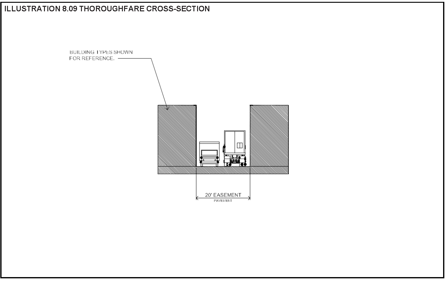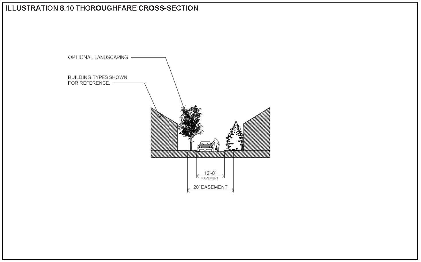 Rear alley: A dedicated right-of-way or easement providing access for service and parking at the rear of a parcel. Not intended for general traffic circulation.