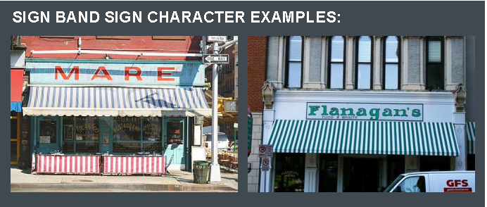 Sign band sign: A sign that is painted on, incorporated in, or attached directly to the sign band or horizontal expression band above a storefront window or transom.