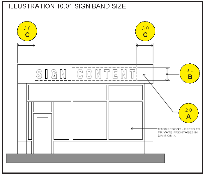 Sign band: An architectural element on buildings that acts as a horizontal upper termination for the storefront private frontage. Sign bands extend the entire width of the building facade above a storefront and may contain signs. Synonymous with horizontal expression band.