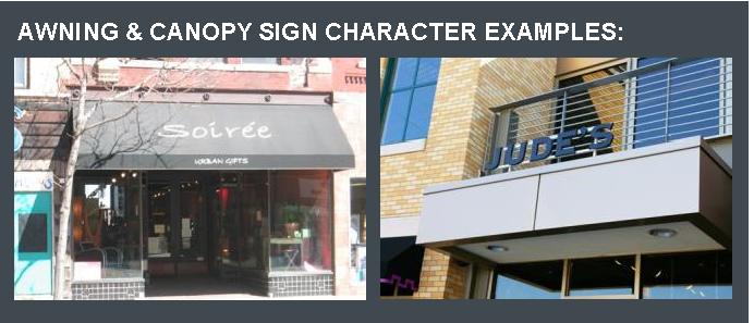 Awnings and canopies. An awning or canopy with a minimum ground clearance of eight feet above adjacent grade may extend five feet maximum from the exterior wall of the building.